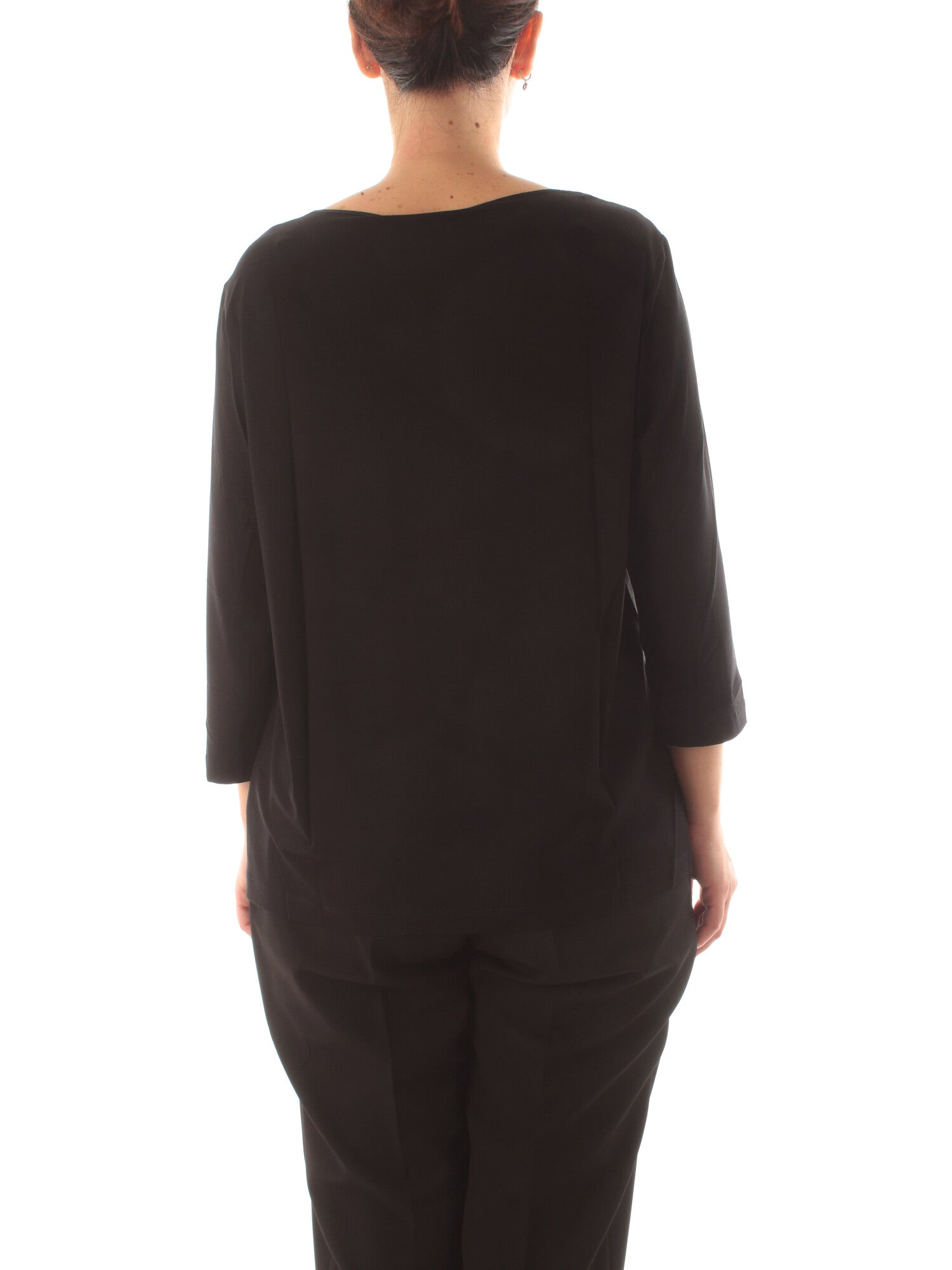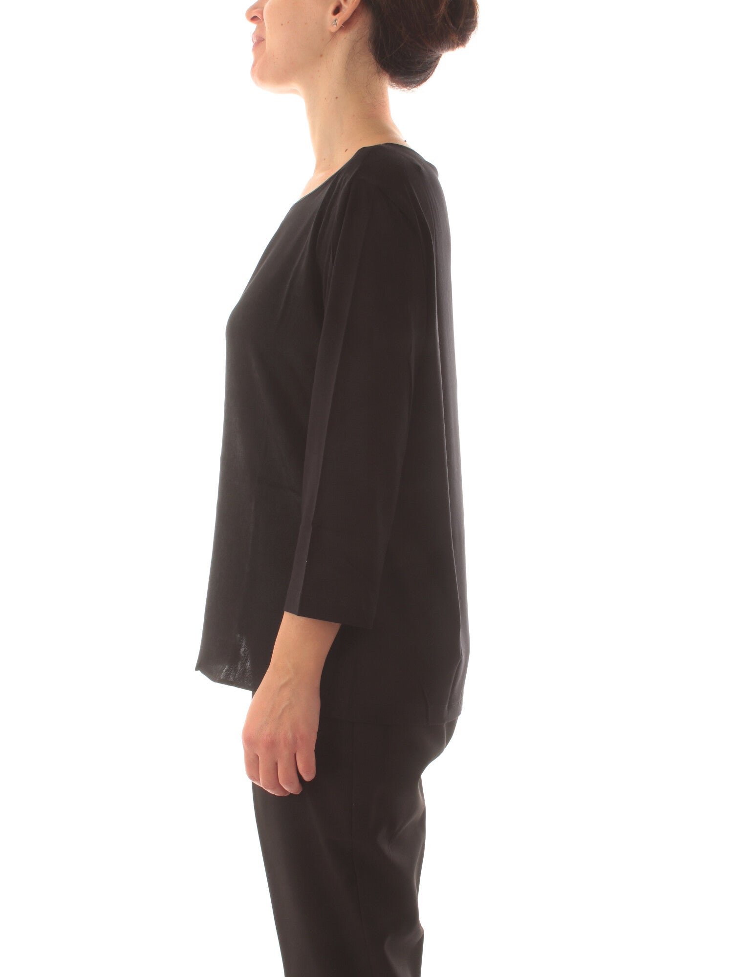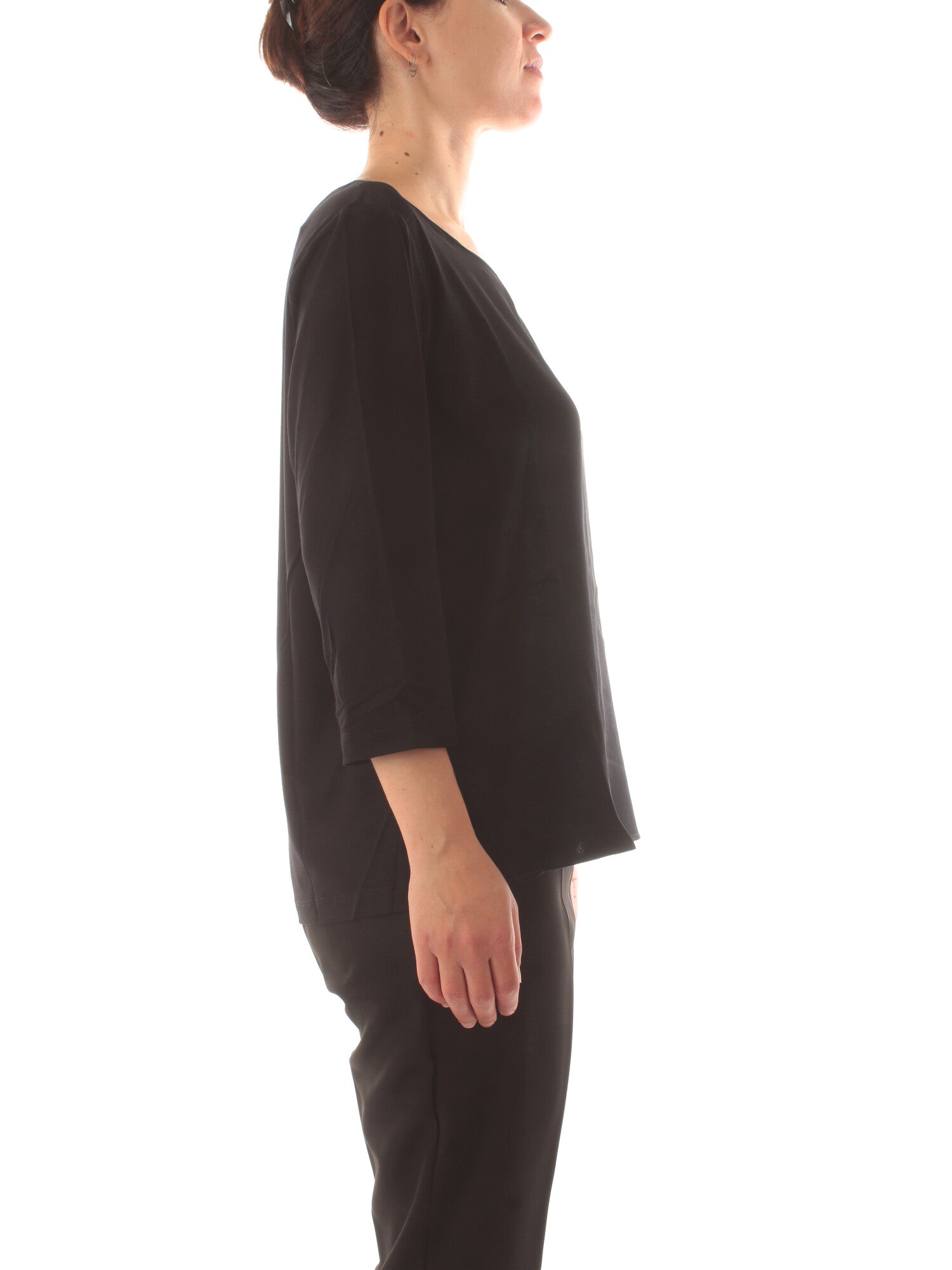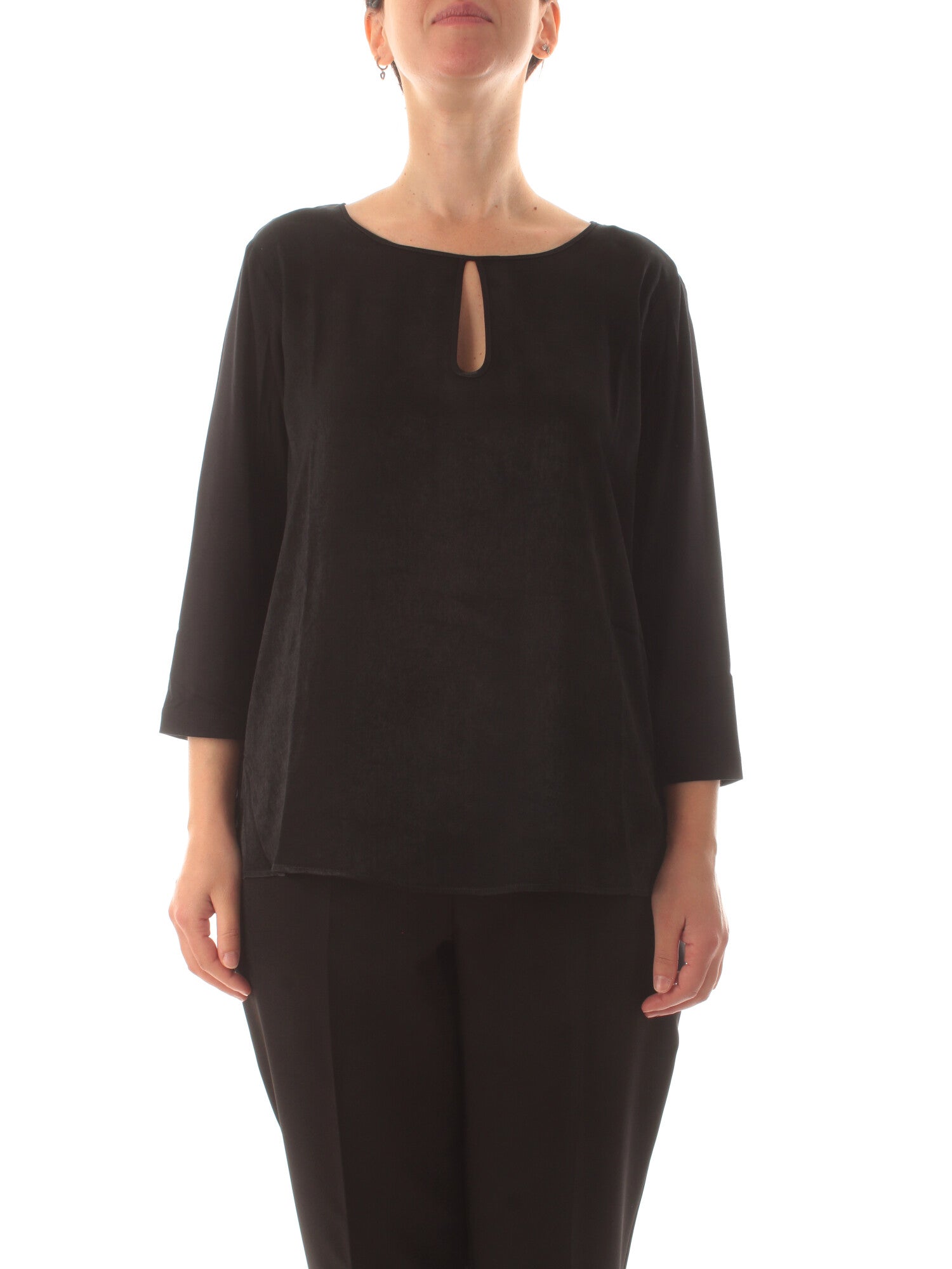 T-shirt in jersey di viscosa e raso con scollo rotondo a goccia e maniche corte. Altezza modella: 170 cm. Taglia indossata: S. 94% viscosa, 6% elastan; tessuto 100% poliestere