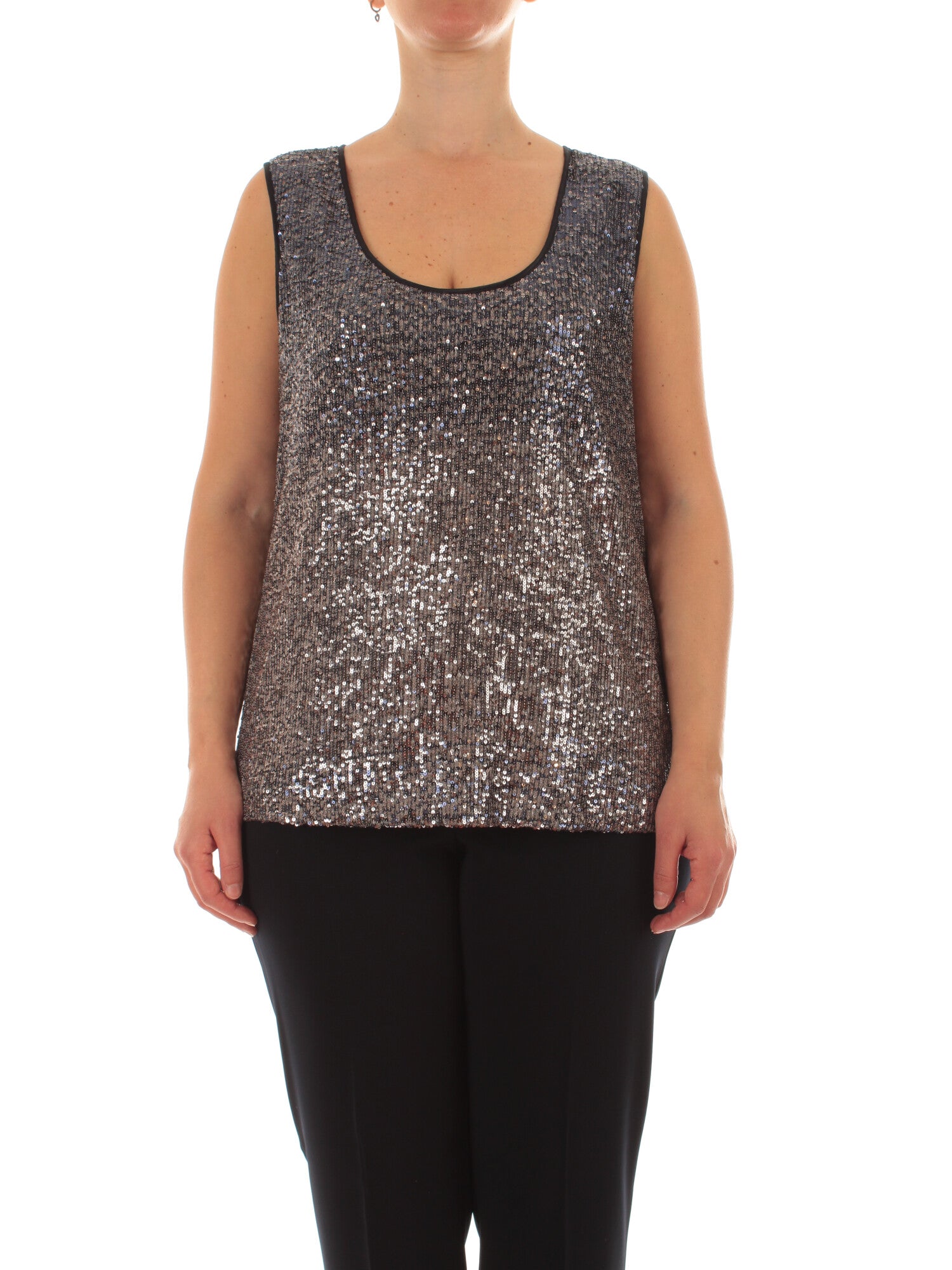 Top in full paillettes sfumate. Linea dritta. Collo ampio tondo. Foderato. Maniche corte in dotazione. Altezza modella: 170 cm. Taglia indossata: 17. 95% poliammide, 5% elastan