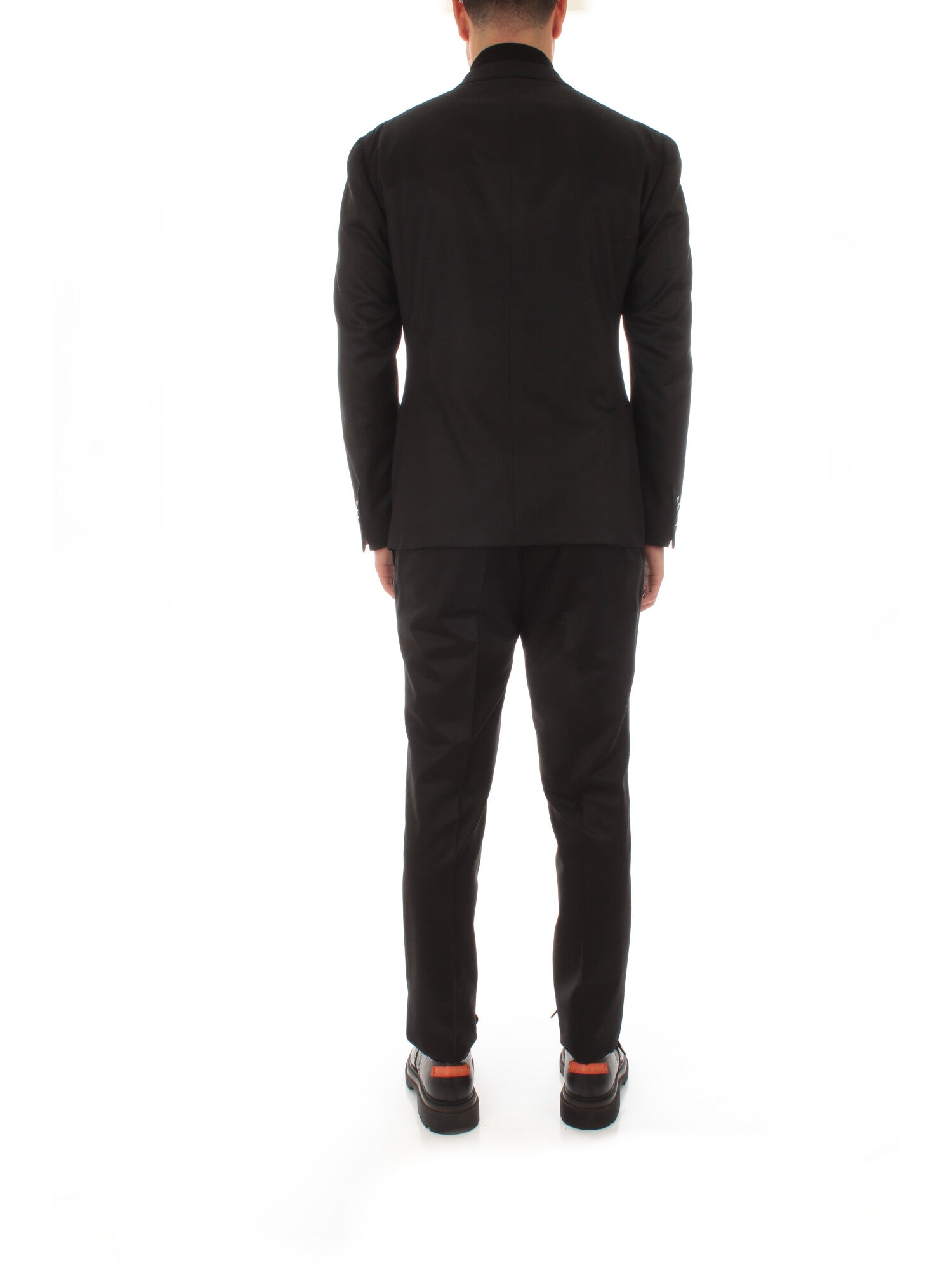 Abito doppiopetto. Giacca con 2 tasche a toppa e una a filo, due spacchetti laterali. Pantalone con pinces. Altezza modello: 190 cm. Taglia indossata: 52. 100% Lana.