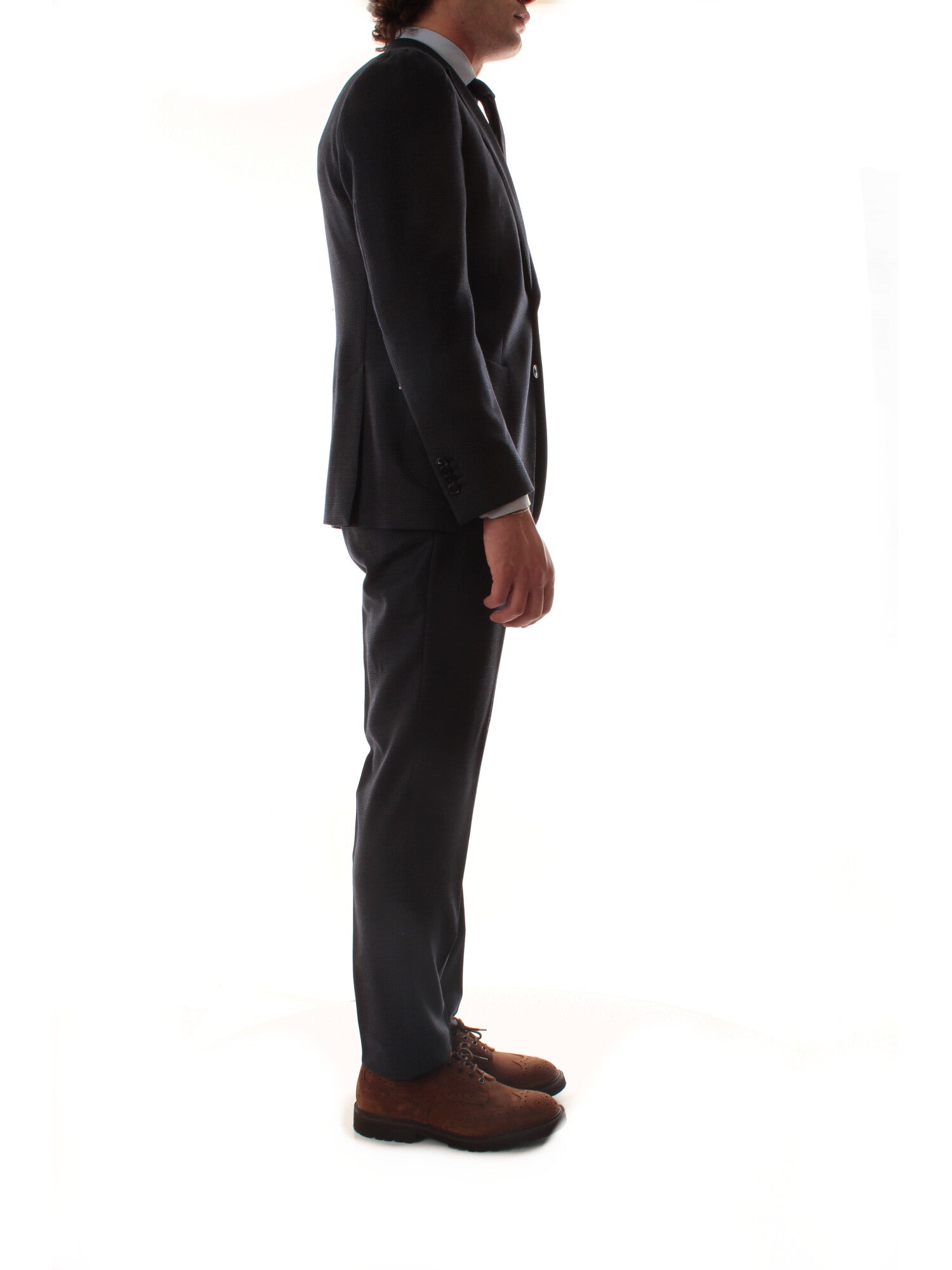Abito monopetto, semi-foderato, in tessuto Principe di Galles. Giacca con due tasche a toppa e una a filo. Spacchetti laterali. Pantalone senza pinces. Altezza modello: 185 cm. Taglia indossata: 50. 100% Lana