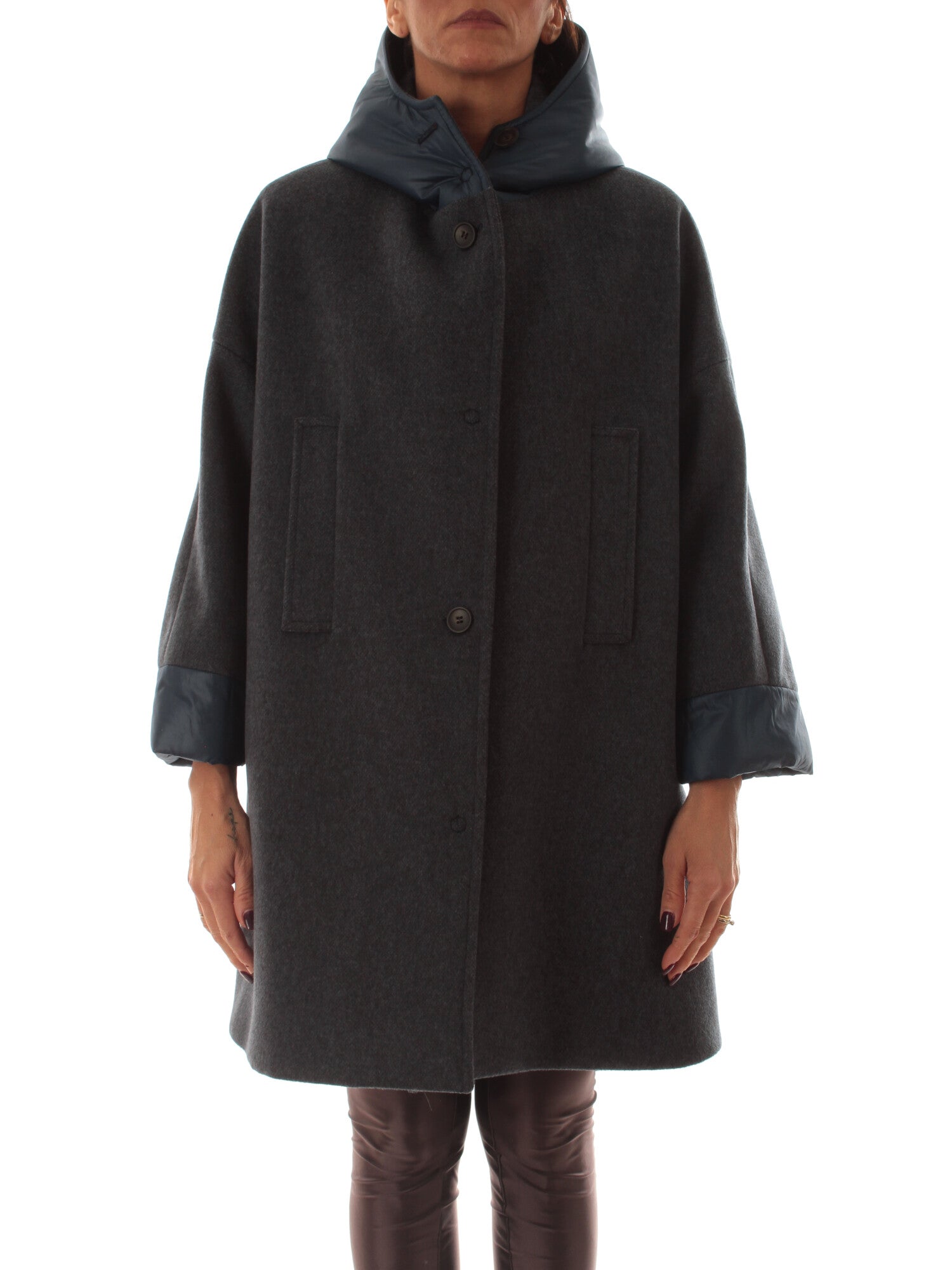 Cappotto in panno con tessuto e fodera in tessuto impermeabile. Chiusura centrale con bottoni a pressione e tasche a filo. Altezza modella: 170 cm. Taglia indossata: 38. 88% poliestere, 12% viscosa