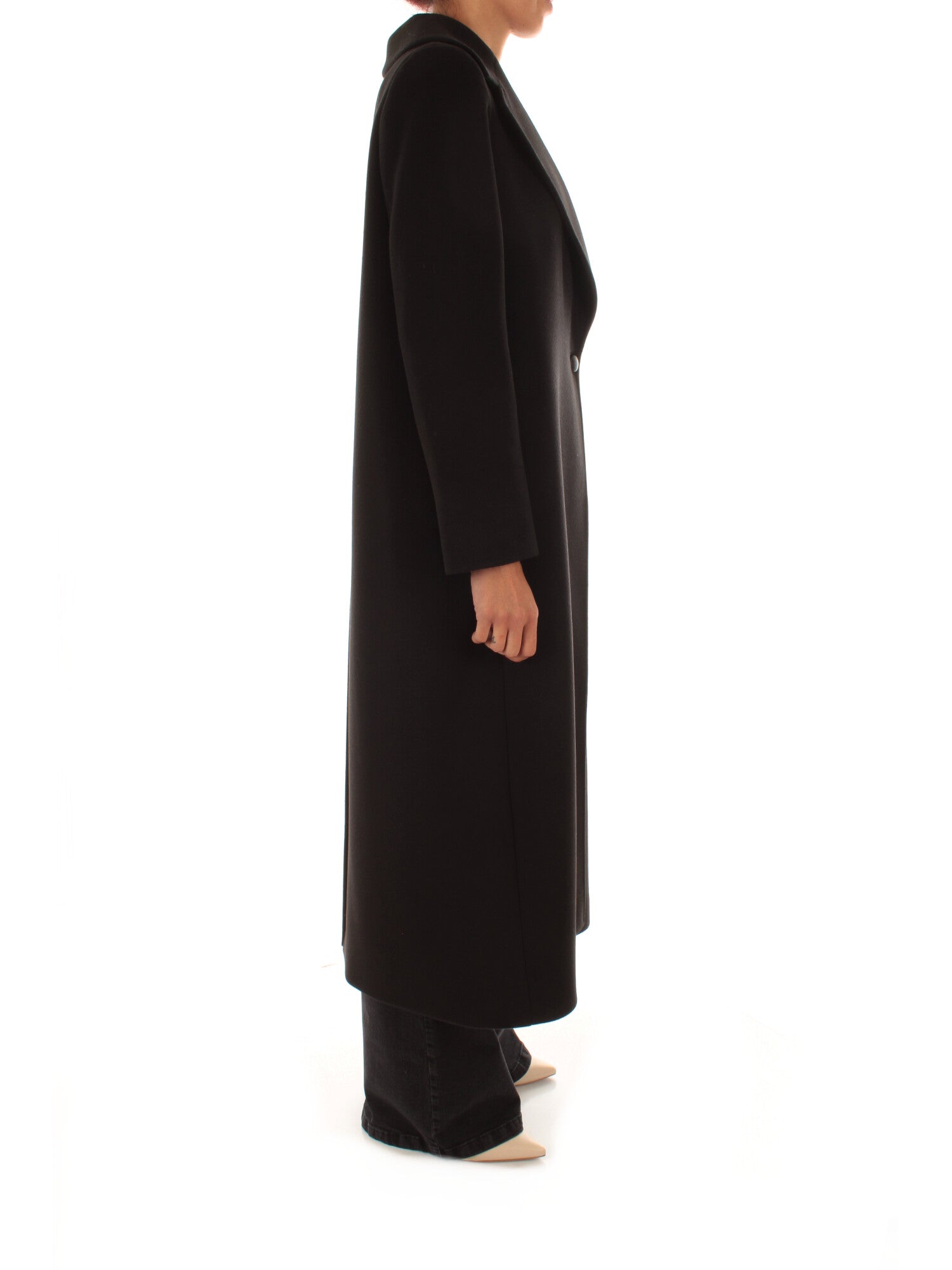 Cappotto lungo in panno double con tasche a filo e chiusura doppiopetto con un bottone. Altezza modella: 170 cm. Taglia indossata: 40. 75% poliestere, 20% viscosa, 5% elastan