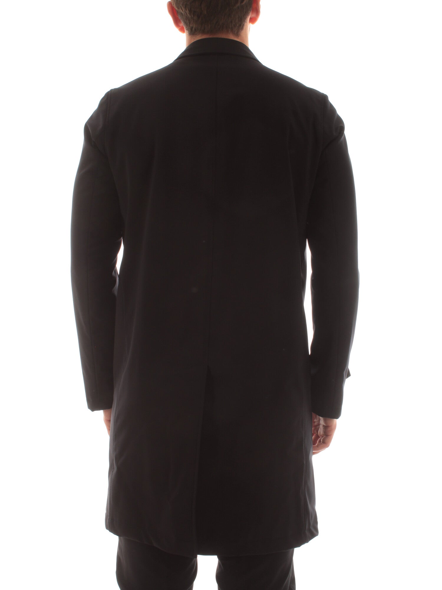 Cappotto monopetto in tessuto impermeabile con colletto a camicia e tasche a filo. Maniche lunghe con alamari. Chiusura con bottoni. Spacco centrale sul fondo. Altezza modello: 190 cm. Taglia indossata: 48. 91% poliestere, 9% elastan