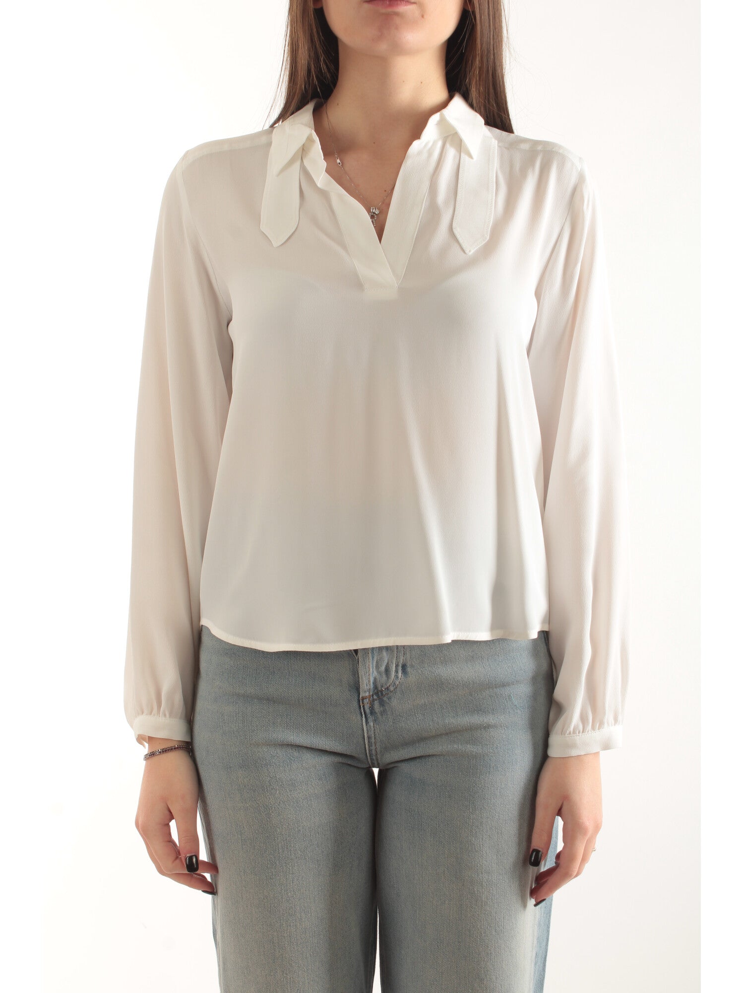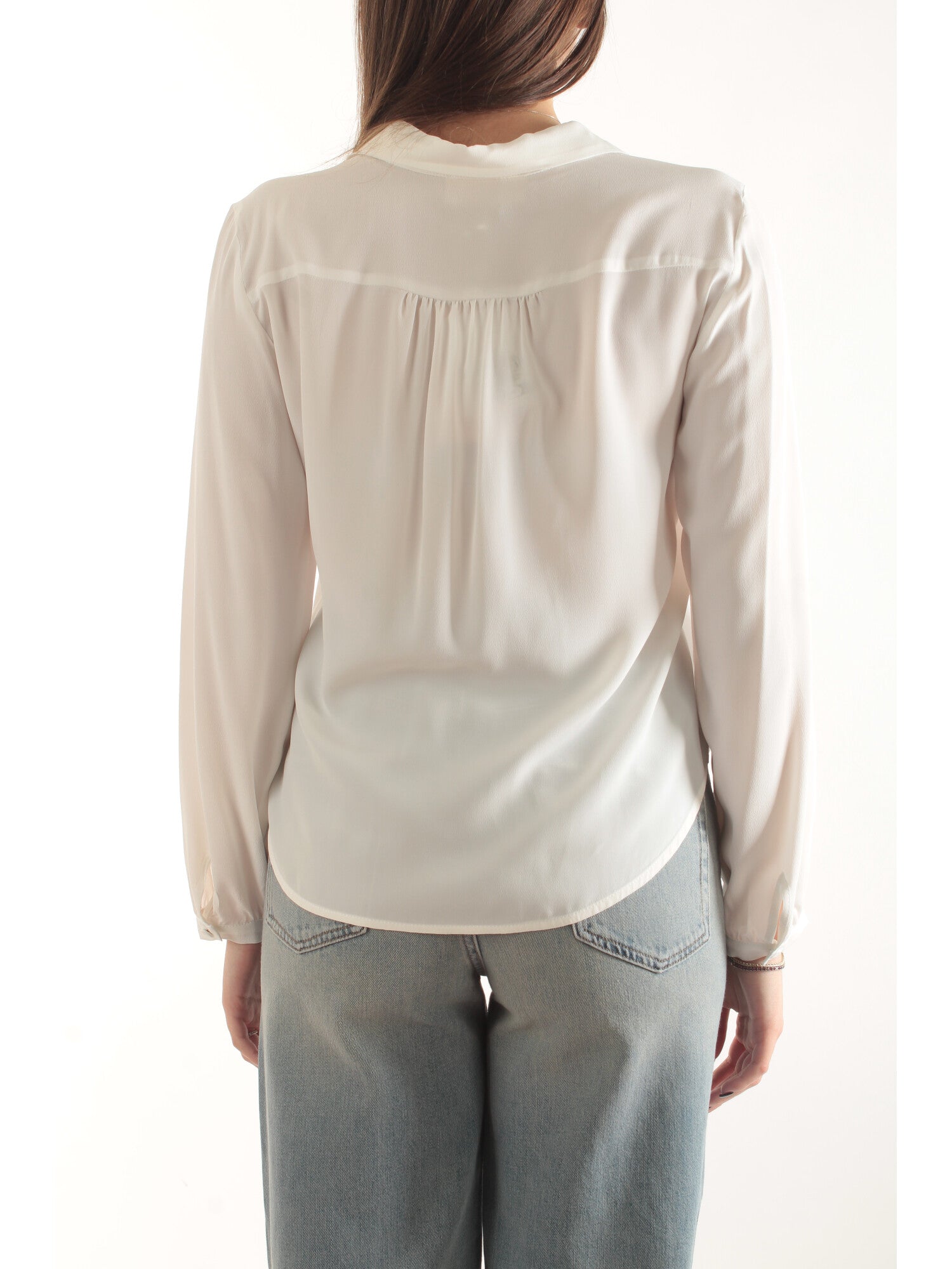 Blusa in crêpe de Chine misto seta. Linea morbida. Colletto con scollo a V e laccio, maniche lunghe, polsi con arricciatura e bottone ricoperto. Retro con arricciatura. Fit regolare. Altezza modella: 170 cm. Taglia indossata: 40. 69% acetato, 31% seta.