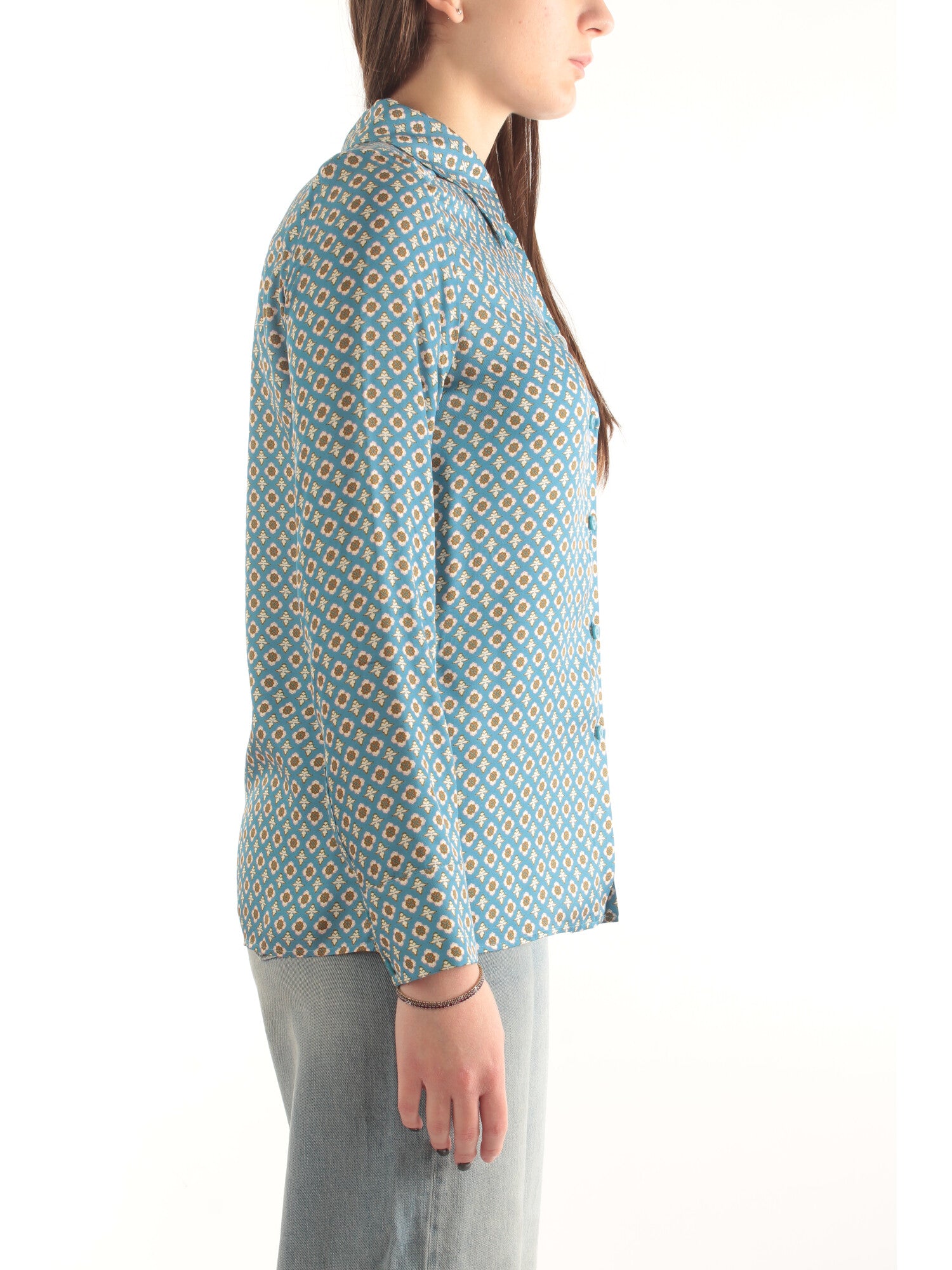 Camicia in twill di viscosa stampato. Linea dritta. Colletto, maniche lunghe, polsini con due bottoni. Chiusura con bottoni, retro con piega centrale. Fit regolare Altezza modella: 170 cm. Taglia indossata: 38. 100% viscosa.