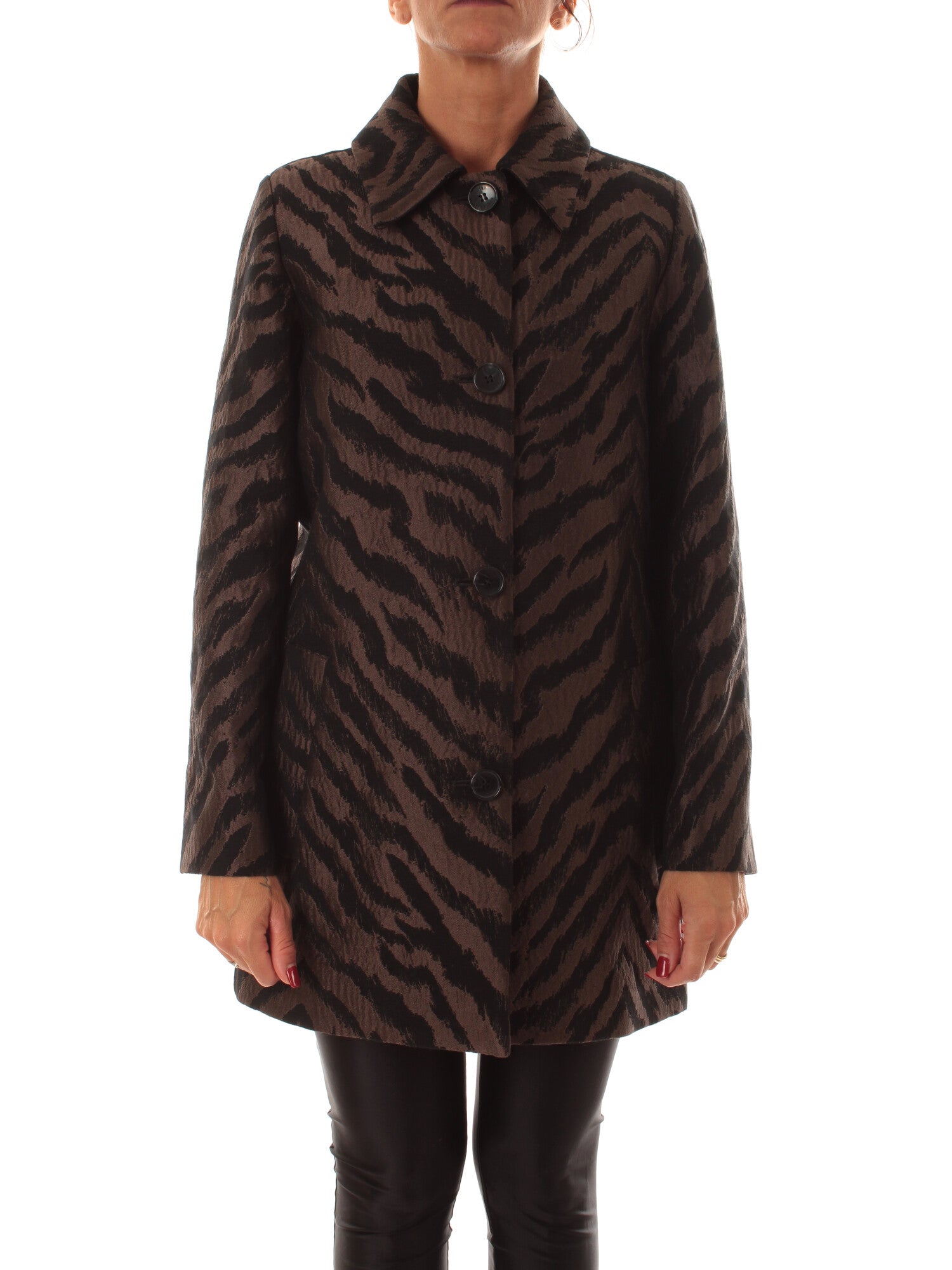 Cappottocorto in tessuto jacquard animalier. Linea dritta. Collo a camicia, maniche lunghe. Chiusura con bottoni, tasche a filetto. Capo semifoderato. Fit regolare. Altezza modella: 172 cm. Taglia indossata: 40. 59% poliestere, 19% acrilica, 16% lana, 6% altre fibre