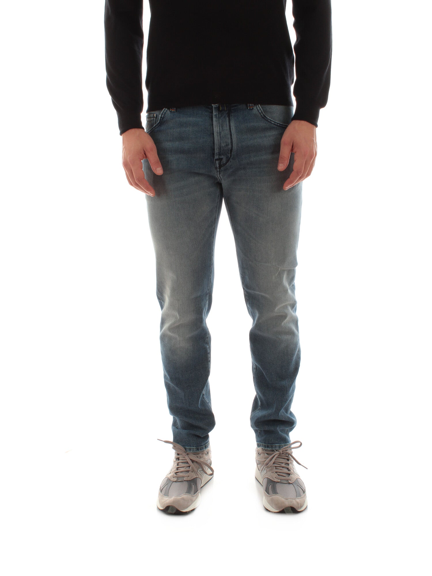 Jeans scott cropped carrot slim fit. Modello a cinque tasche con logo ricamato sul taschino. Passanti al punto vita. Chiusura con bottoni. Salpa in cavallino con logo laserato. Include bandana con stampa di collezione. Profumati con l’esclusiva fragranza Jacob Cohën. Altezza modello: 190 cm. Taglia indossata: 33. 98% Cotone, 2% elastan