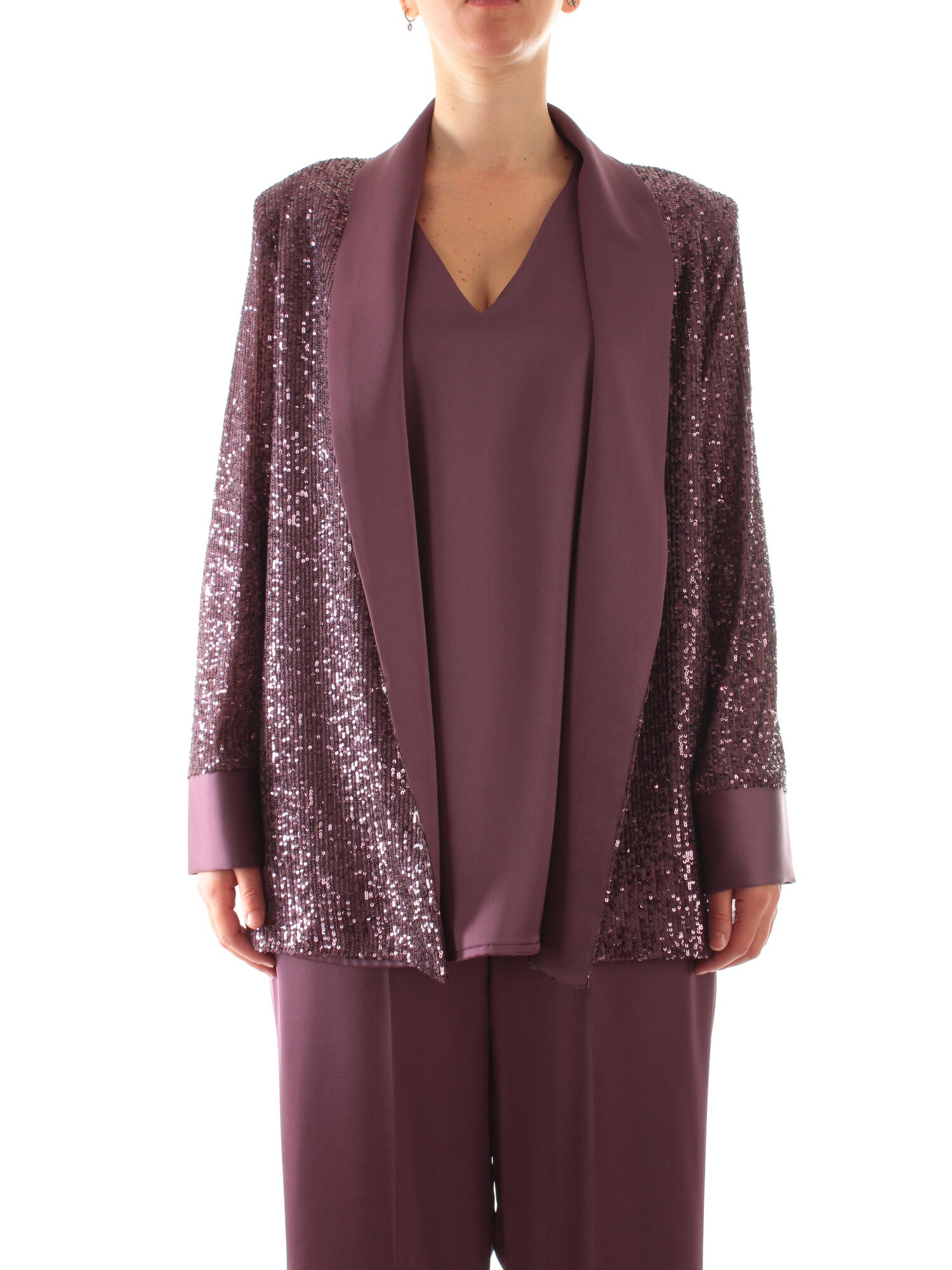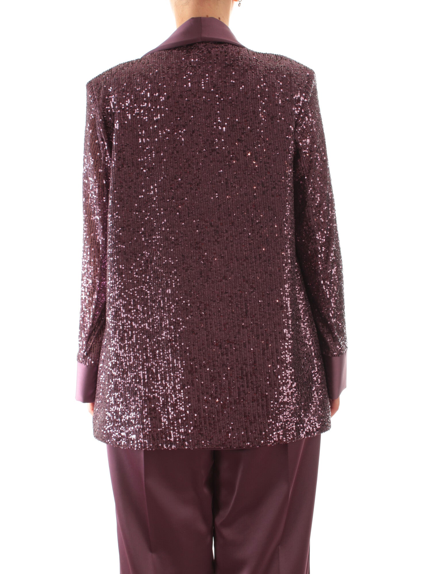 Blazer monopetto in full paillettes con dettagli in raso. Modello senza abbottonatura. Altezza modella: 170 cm. Taglia indossata: 46. 93% poliestere, 7% elastan