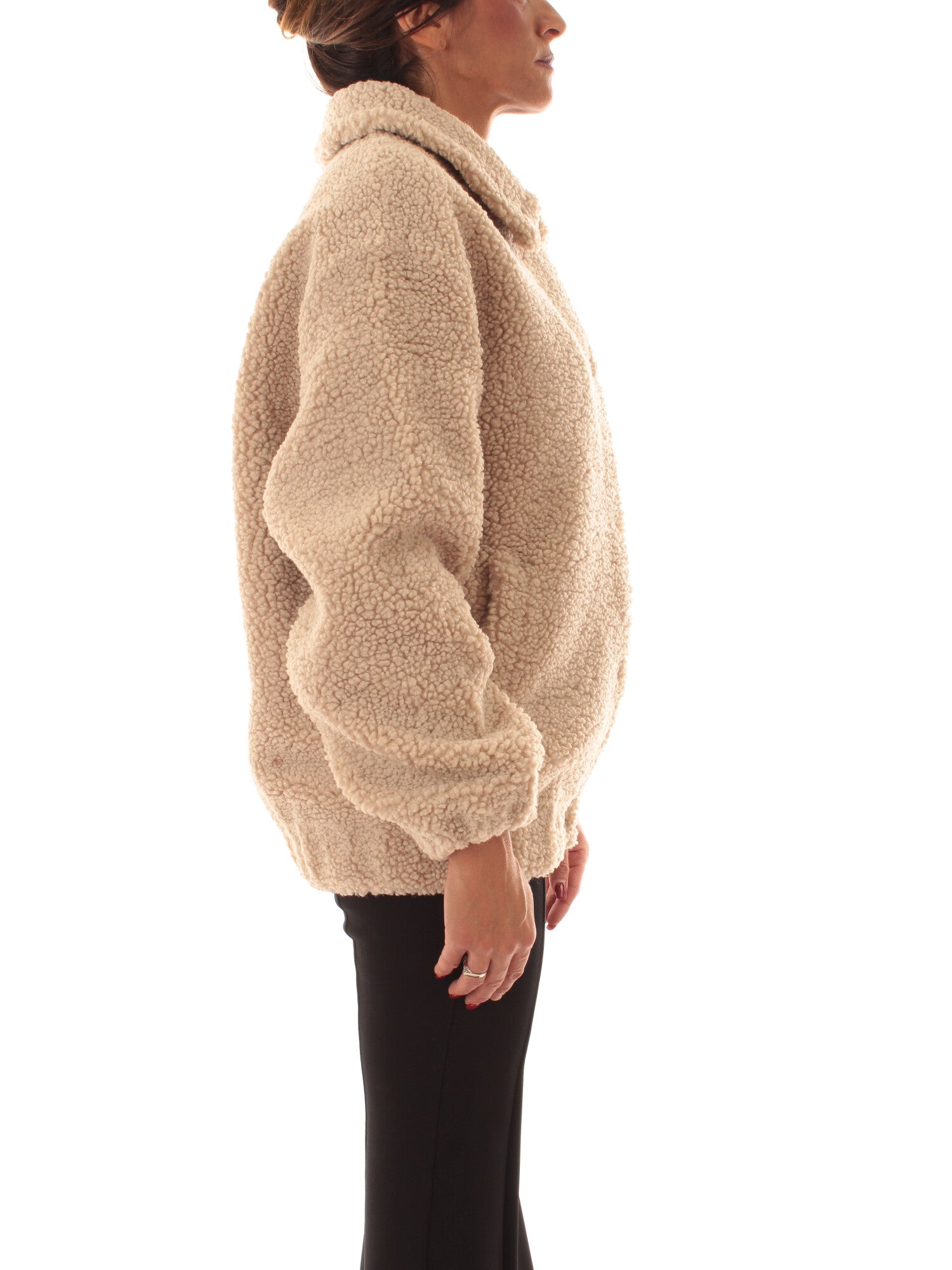 Giacca in tessuto teddy. Collo a camicia e tasche laterali a filo. Chiusura nascosta con bottoni a pressione. Patch con logo sul retro a contrasto di colore. Altezza modella: 172 cm. Taglia indossata: S. 100% poliestere