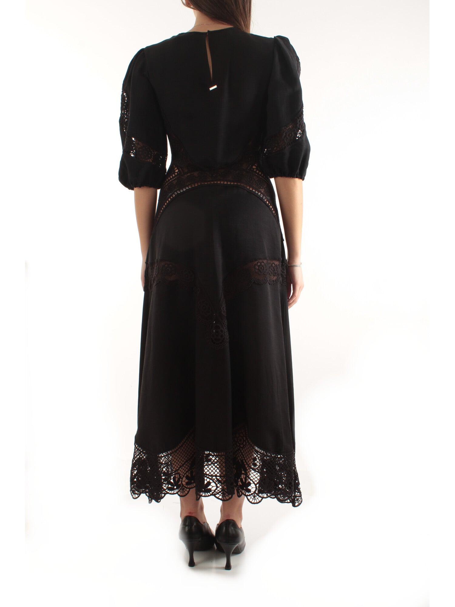 Abito lungo in tela di misto lino e viscosa con inserti di rete ricamata e motivi floreali. Ha collo tondo, carré sagomato a cuore, maniche a tre quarti leggermente a sbuffo con arricciatura ai giri, chiusura con zip al fianco, fondo smerlato, linea fit & flare. Altezza modella: 170 cm. Taglia indossata: 40. 70% viscosa 30% lino.
