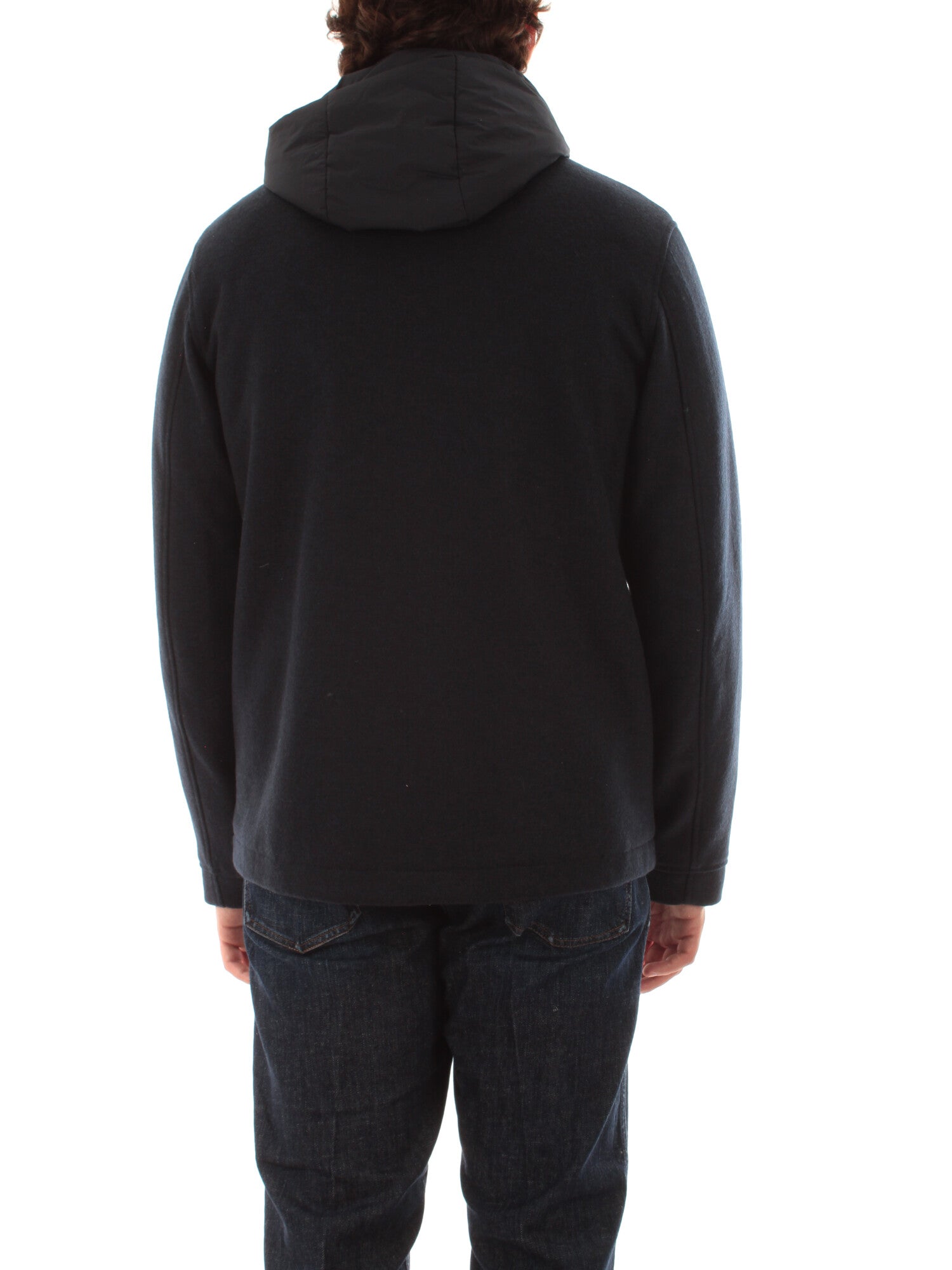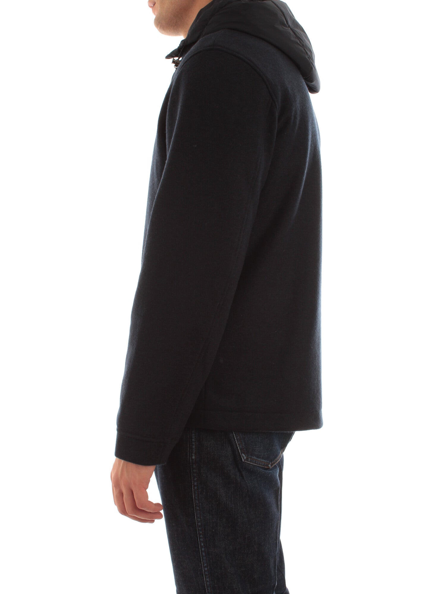 Giacca a camicia con esterno in lana e interno imbottito con cappuccio regolabile con coulisse. Chiusura con bottone a pressione e tasche laterali con bottoni. Altezza modello: 185 cm. Taglia indossata: M. 48% poliestere, 46% lana, 6% cotone