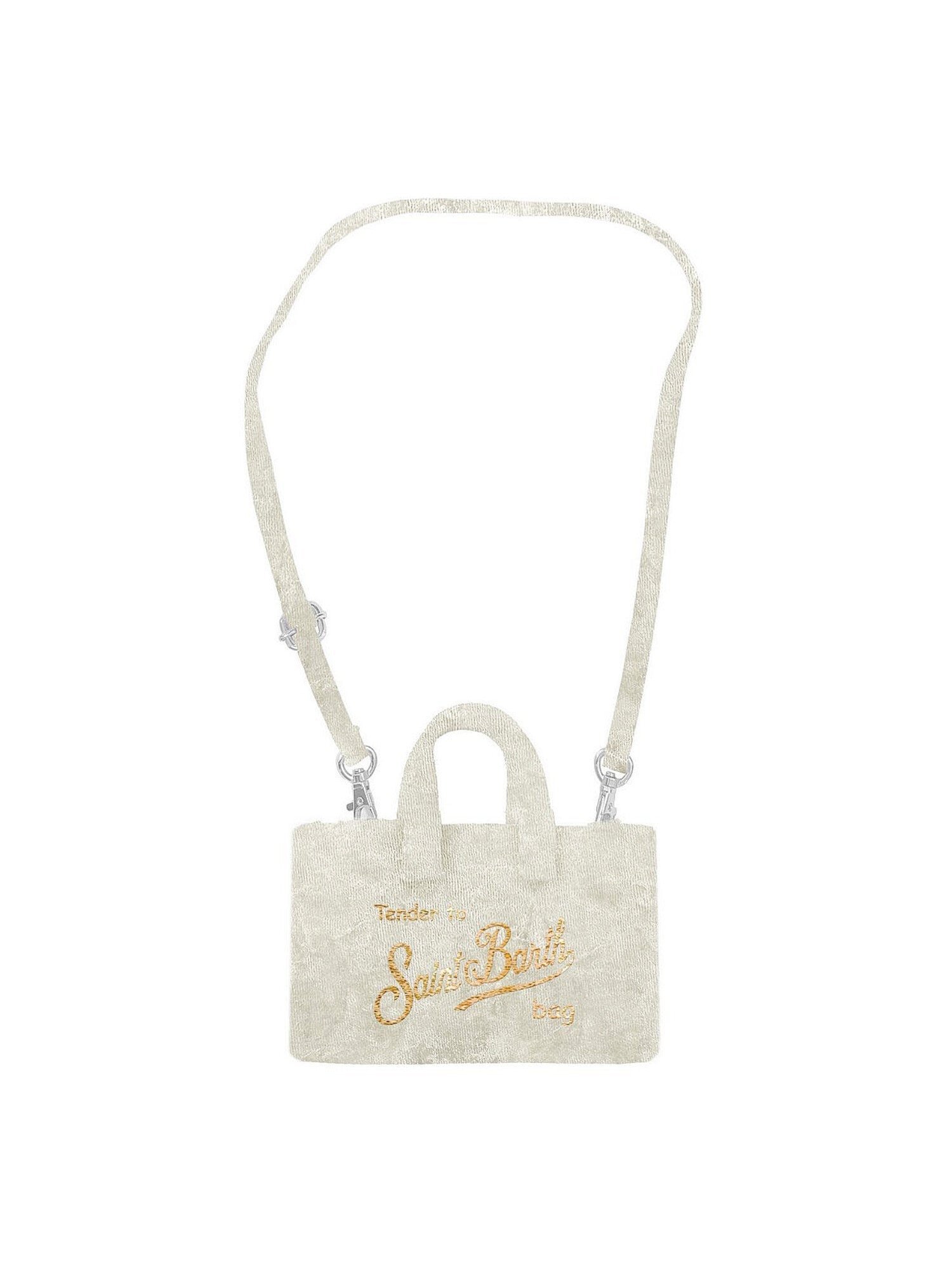 Micro borsa porta cellulare. Tessuto in velluto, ricamo logo San Barth e tracolla staccabile. Chiusura magnetica. Dimensioni: 15 x 10 x 3,5 cm. 100% Poliestere.