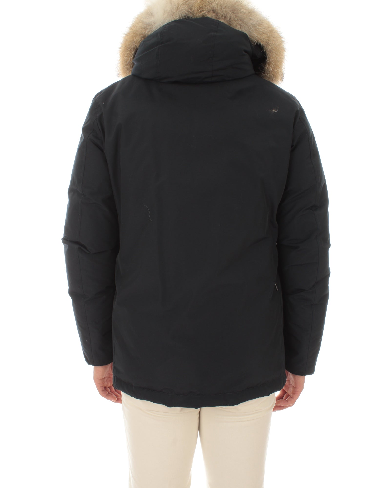 Parka realizzato in tessuto Ramar Cloth resistente all'acqua e al vento, imbottito in piuma d'anatra 80/20. Cappuccio protettivo con inserto staccabile in pelliccia di coyote, chiusura con zip e bottoni, tasche scaldamani, tasche applicate con patta e bottoni, tasche interne, tracolla interna, polsini interni a costine. Altezza modello: 190 cm. Taglia indossata: L. Esterno: 60% Cotone, 40% Poliammide. Interno: 100% Poliammide. Imbottitura: 80% Piumino d'anatra grigia, 20% Piuma. Pelliccia: Coyote (Canis Latrans) - origine Canada.