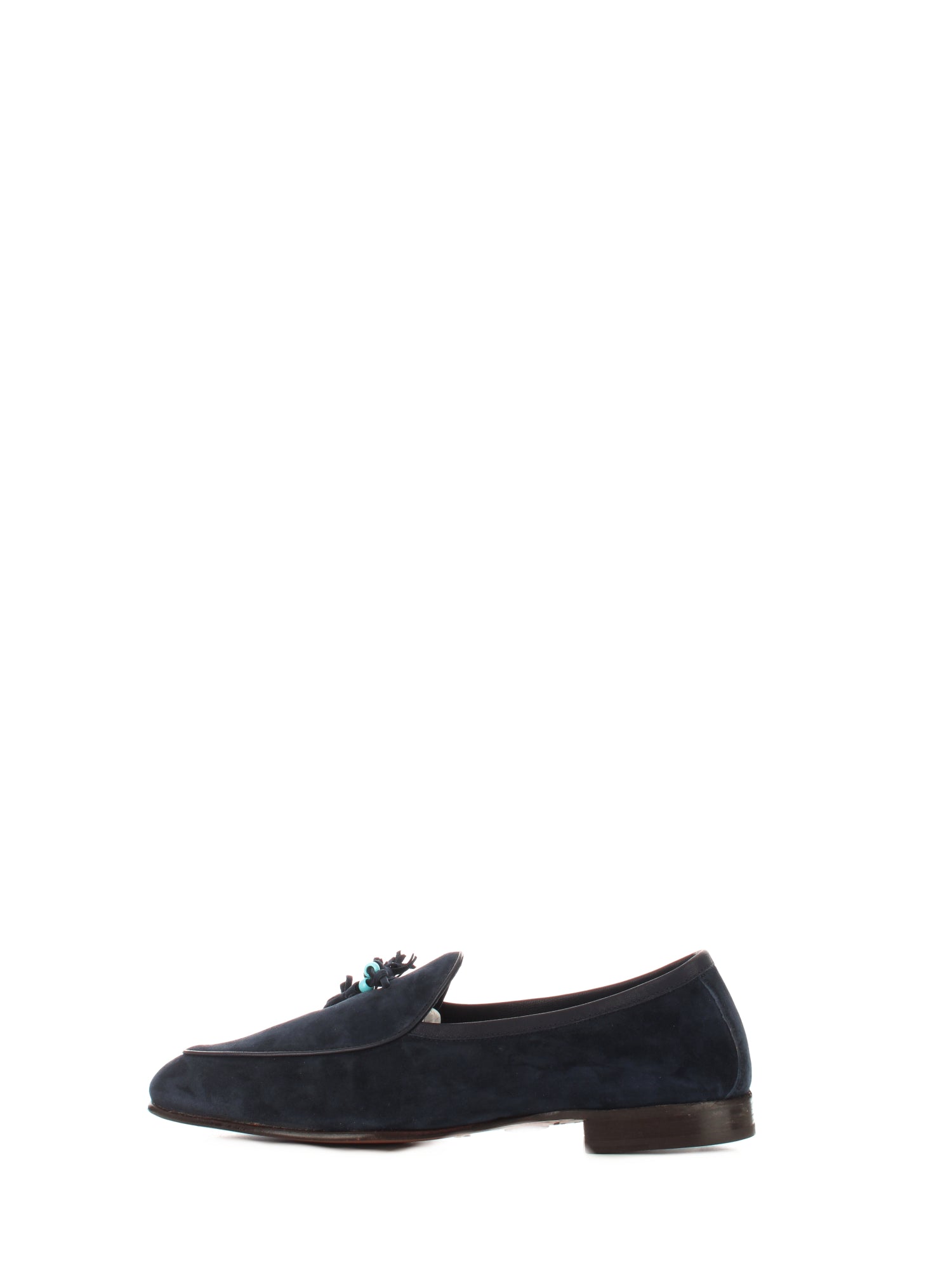 Mocassino in pelle scamosciata con nappine e suola in cuoio. Altezza tacco: 2 cm