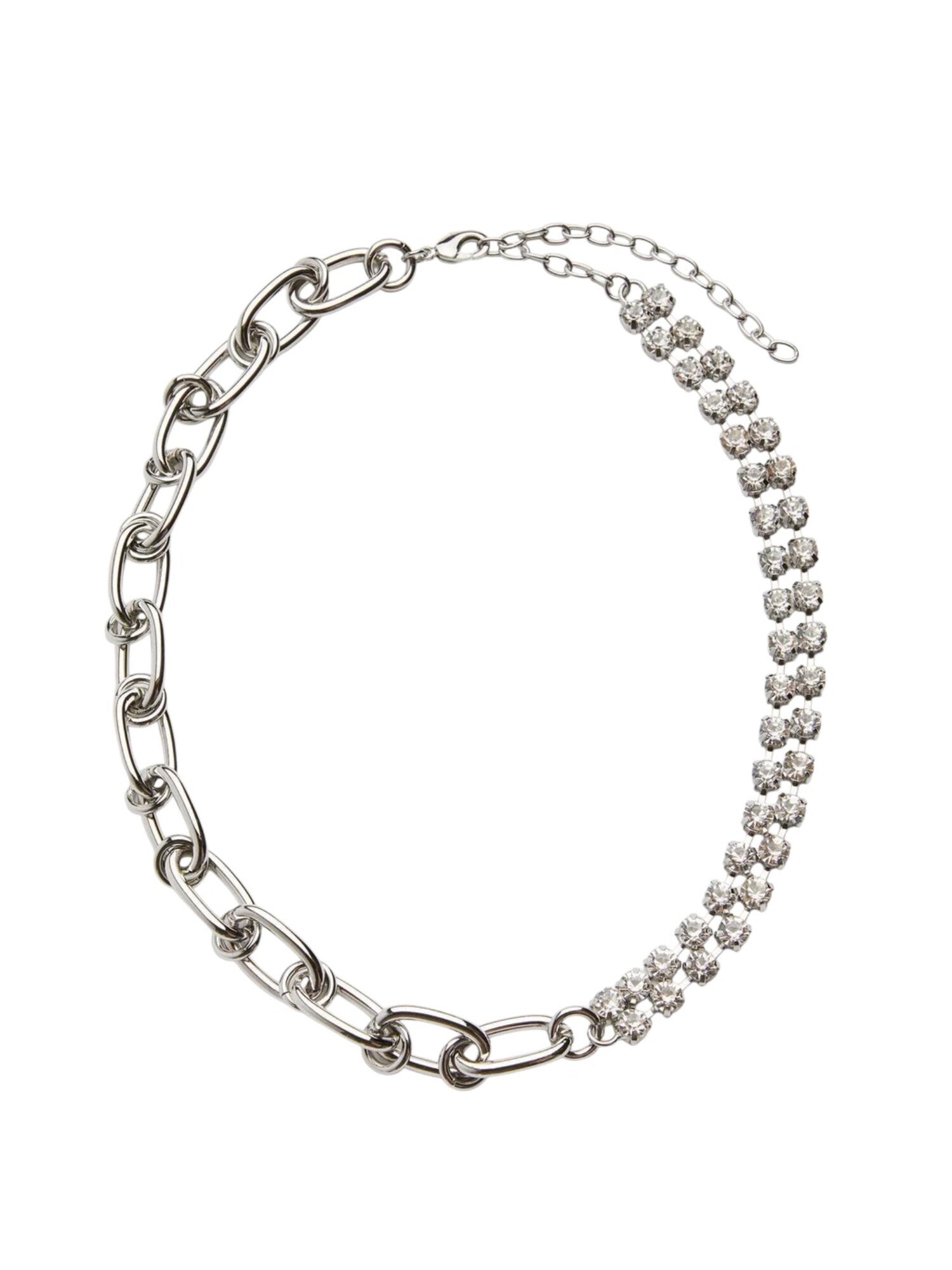 Collana con file di strass scintillanti e a catena. Chiusura regolabile con moschettone. Metallo