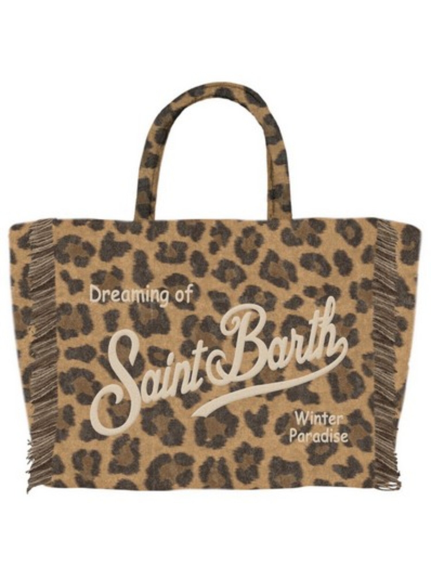 Borsa in tessuto faux fur a disegno animalier. Logo St.Barth ricamato. Chiusura con zip. Doppi manici in similpelle. Tracolla removibile. Orli sfrangiati. 29 x 25 x 12 cm. 85% poliestere, 15% lana