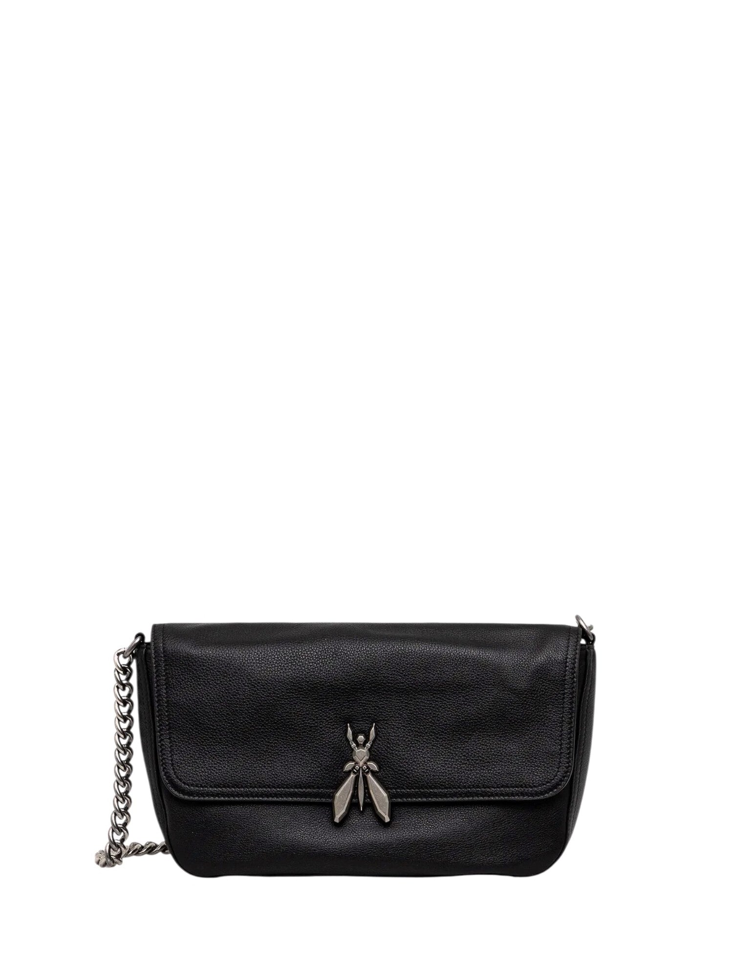 La borsa media Essential Fly dal design flap bag, si distingue per la pelle ultra-morbida e la chiusura con logo Fly oversize in 3D, che dona un tocco audace e dal carattere glam-rock. Tracolla in catena con moschettoni. Tasca interna aperta; label interna in tessuto "Patrizia Pepe Fly". Dimensioni: 29,5 cm x 20 cm x 8 cm. Altezza manici (luce) 33 cm. 100% pelle