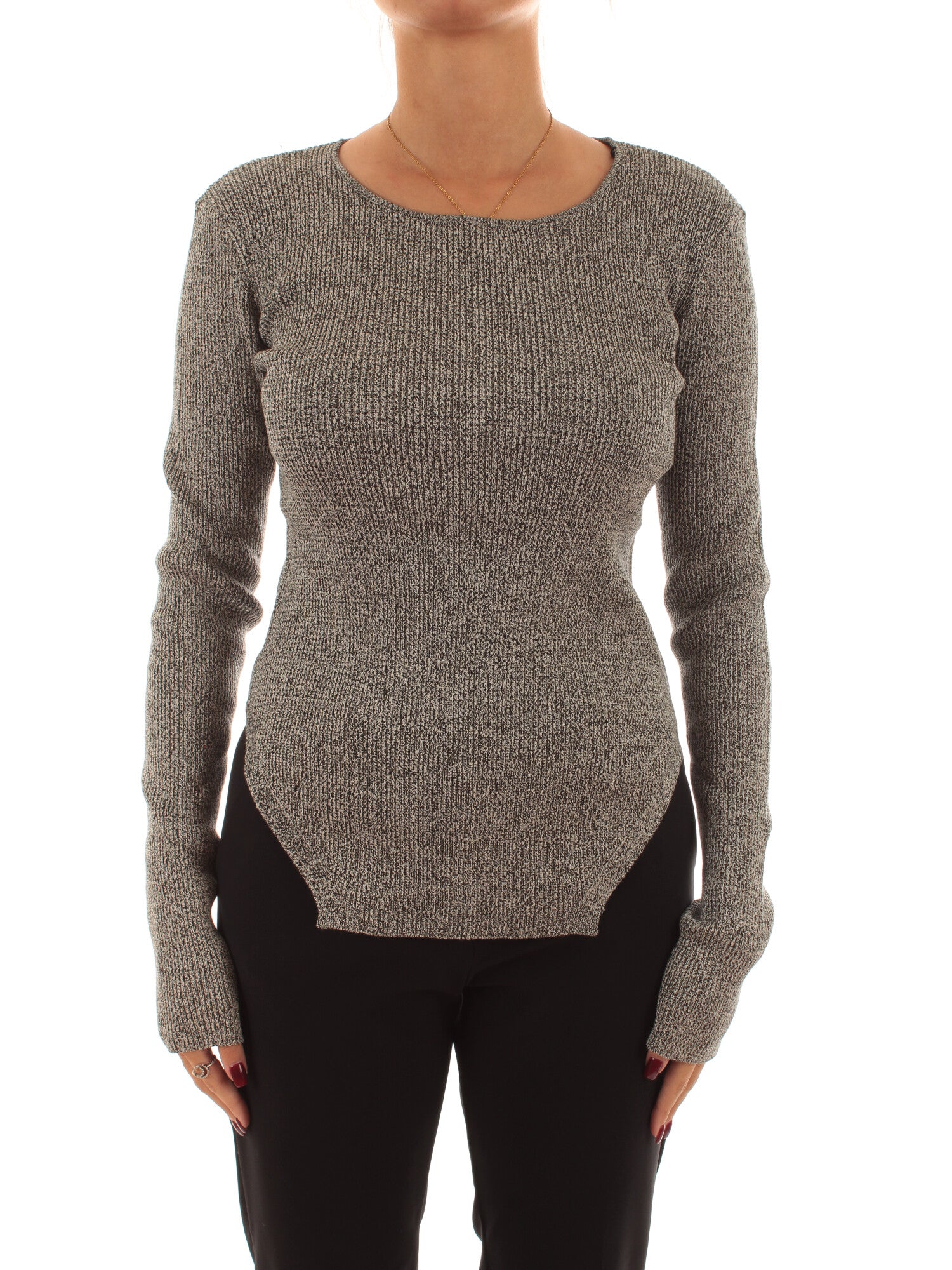 Maglia fine aderente a maniche lunghe con sagomatura effetto body a fondo capo e cut-out che si apre come un oblò sulla schiena, impreziosito da fibbia in metallo. Soffice e lavorata in costina. Altezza modella: 170 cm. Taglia indossata: I. 66% Viscosa, 29% Poliestere, 5% Poliestere Film