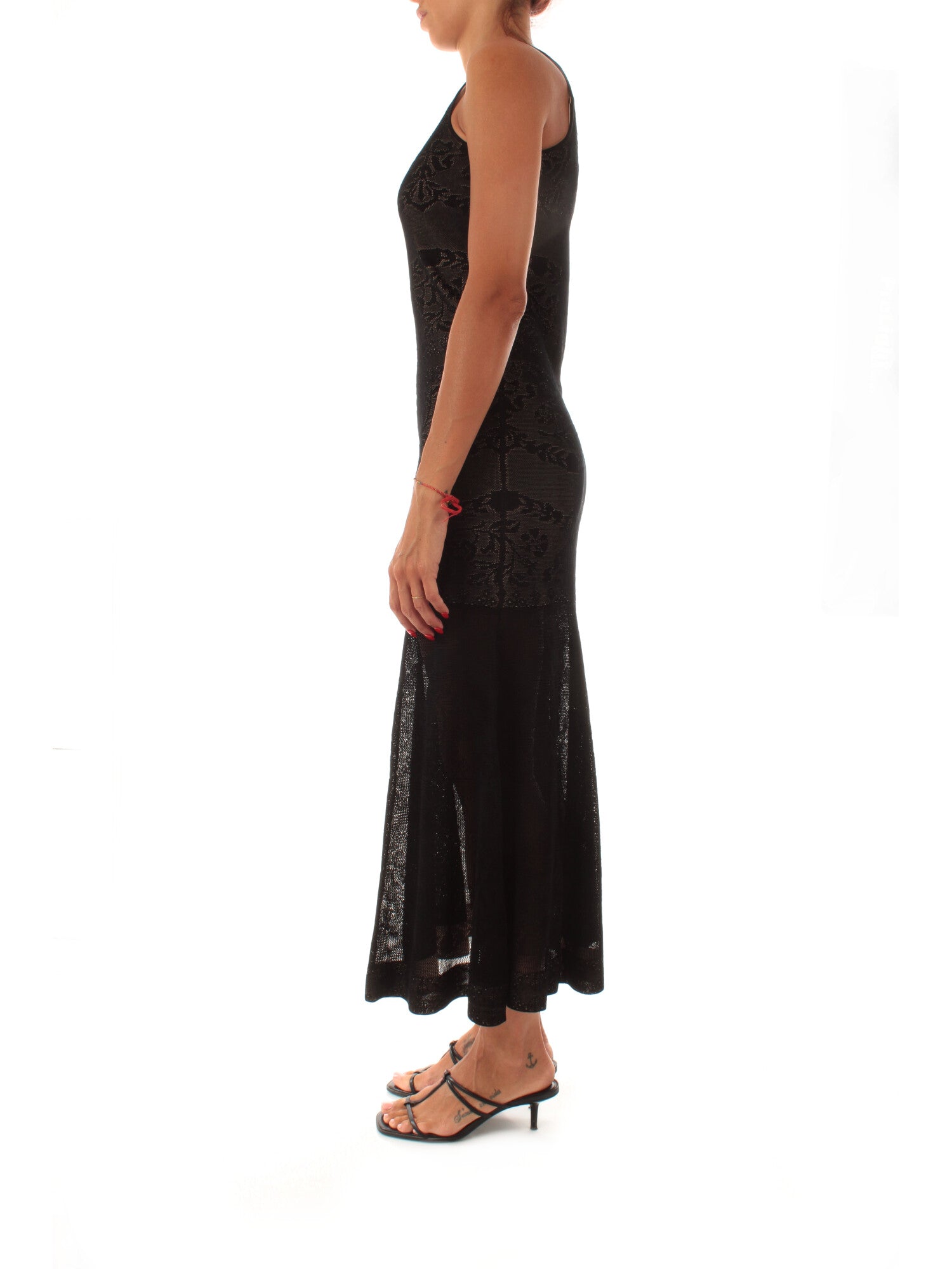 Abito lungo in maglia di viscosa con lavorazione double bicolore e punzonature nella parte esterna del capo che in trasparenza evidenziano il disegno. Ha collo tondo, apertura a goccia con bottone sul retro, linea fitted con gonna ampia. Altezza modella: 172 cm. Taglia indossata: S. 100% viscosa