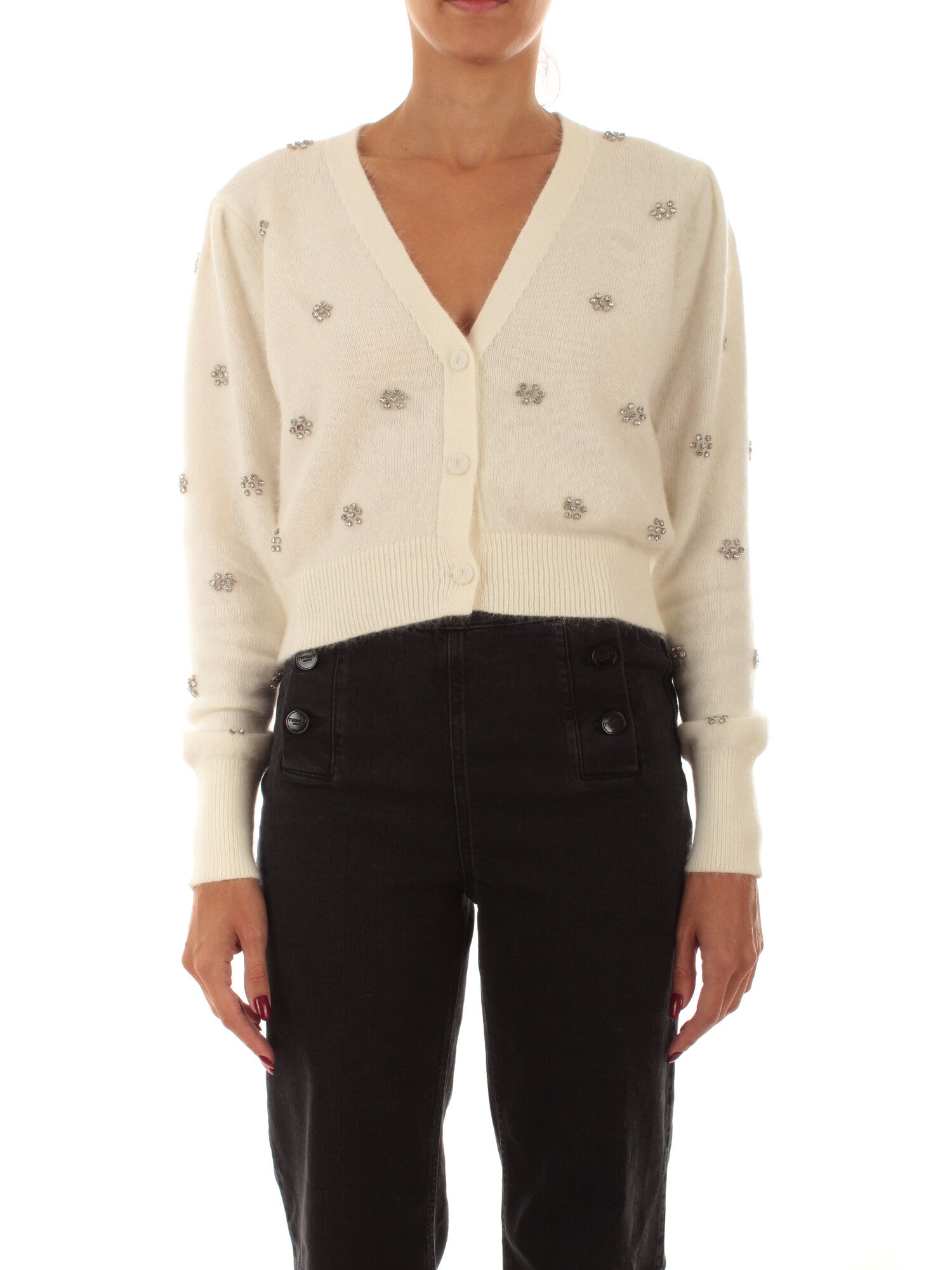 Cardigan crop con ricamo di castoni sulle maniche e sul davanti. Chiusura centrale con bottoni e scollo a V. Altezza modella: 172 cm. Taglia indossata: S. 70% poliammide, 30% angora