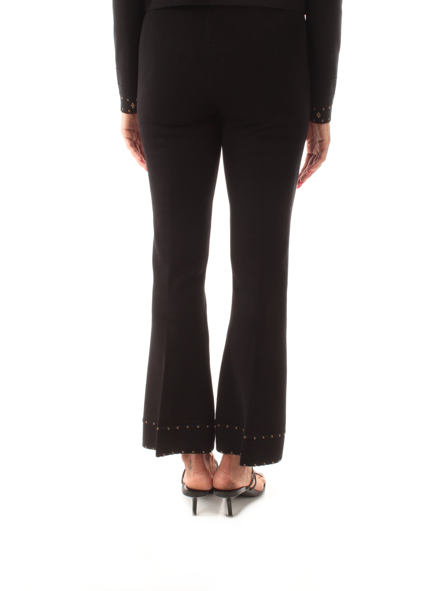 Pantaloni in maglia di viscosa stretch con lavorazione rasata, applicazione di borchie strass, elastico in vita, placchetta logo Oval T, linea flare. Altezza modella: 172 cm. Taglia indossata: S. 60% viscosa 26% poliestere 14% poliammide