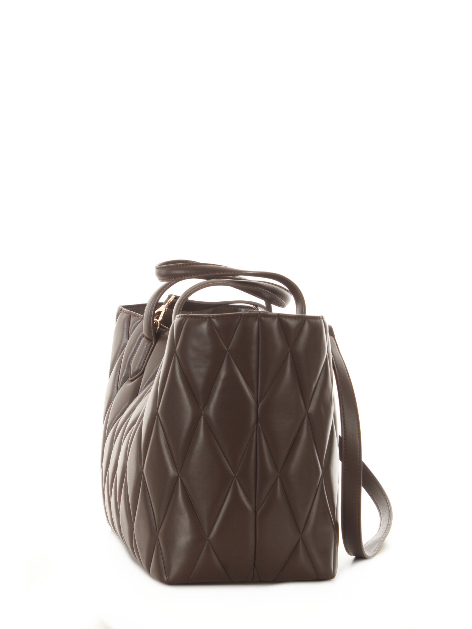 Tote bag in simil pelle con trapuntature. Doppi manici, tracolla removibile e chiusura con magnete e clip. Tramezza interna con zip. Misure: 36x26x15 cm. 100% poliuretano; fodera 100% poliestere
