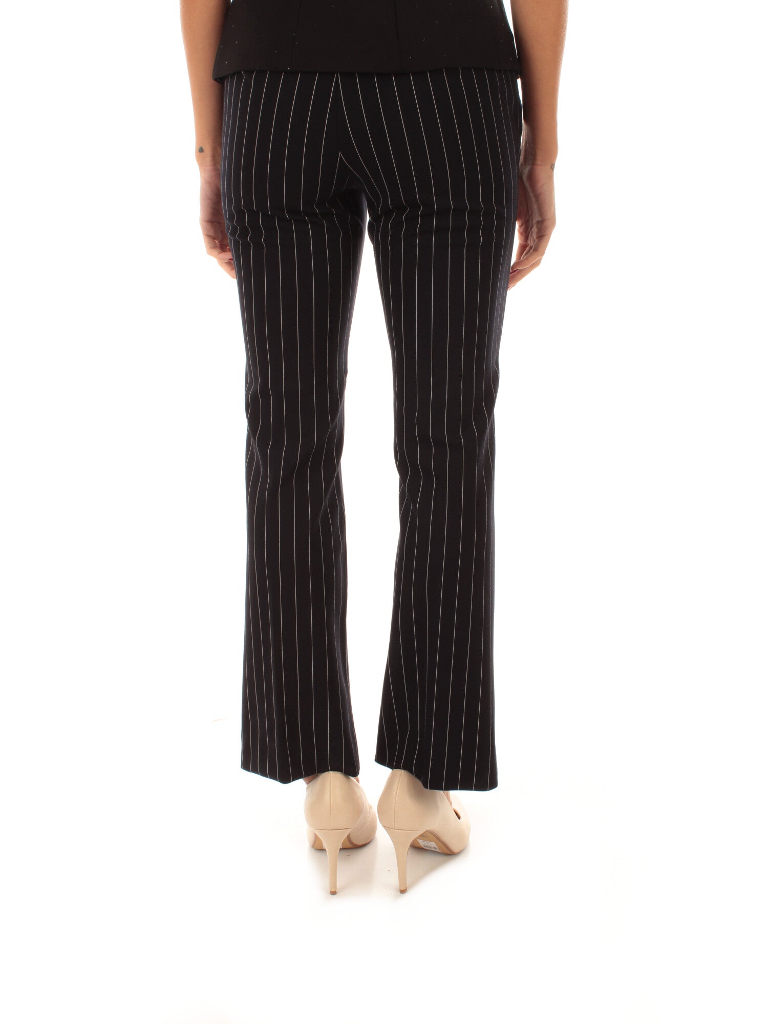 Pantalone in jersey gessato lavorato con punto Roma. Fit aderente semi flare. Chiusura con bottone a pressione e zip nascosta. Tasche laterali alla francese. Piega stirata fronte e retro. Altezza modella: 172 cm. Taglia indossata: 40. 36% viscosa, 34% poliammide, 22% poliestere, 8% elastan