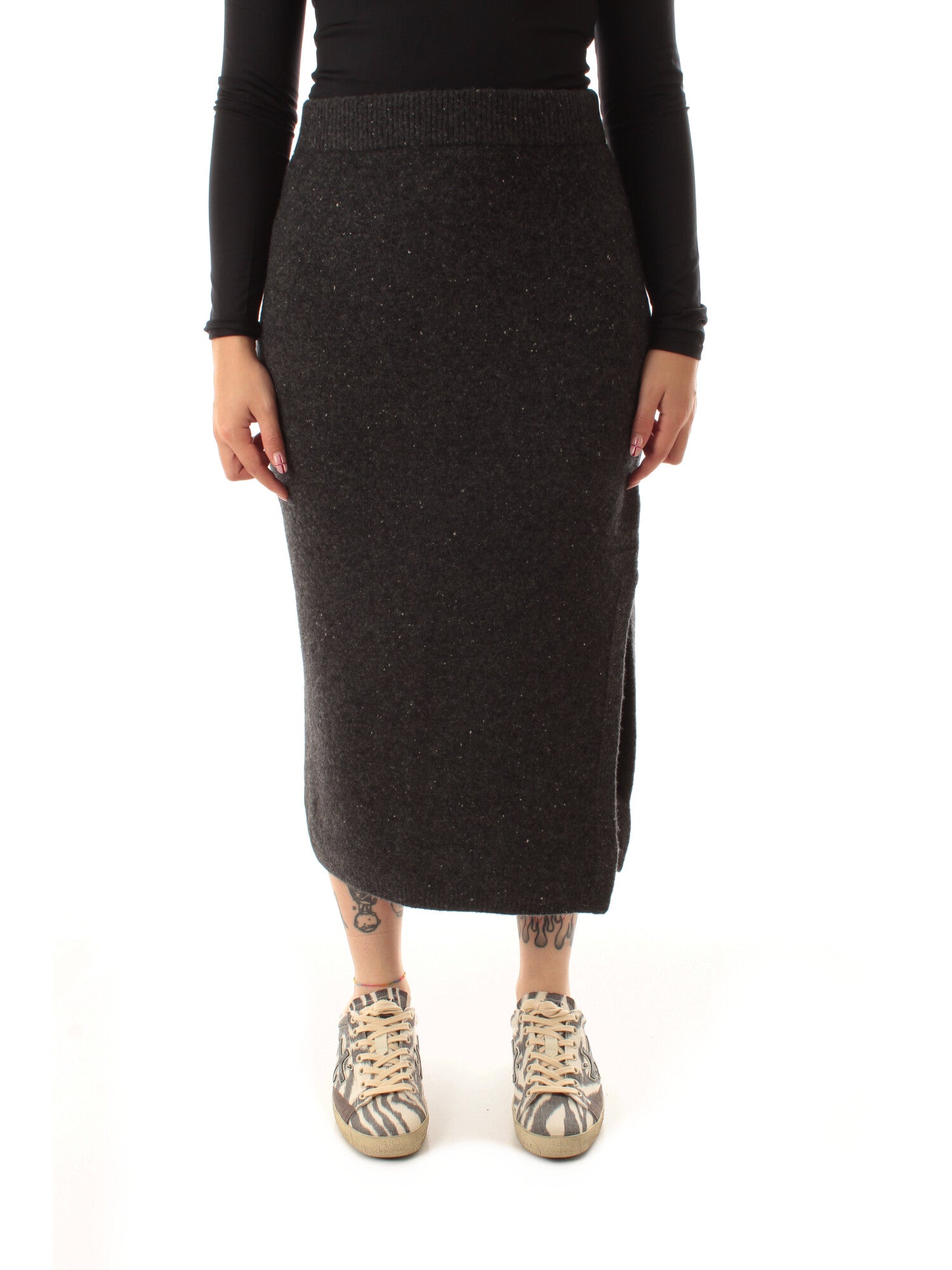 Gonna lunga in maglia misto lana e cotone. Linea aderente. Chiusura con elastico in vita. Spacco laterale. Fit aderente. Altezza modella: 172 cm. Taglia indossata: S. 48% lana, 23% poliammide, 20% cotone, 5% seta, 4% elastan