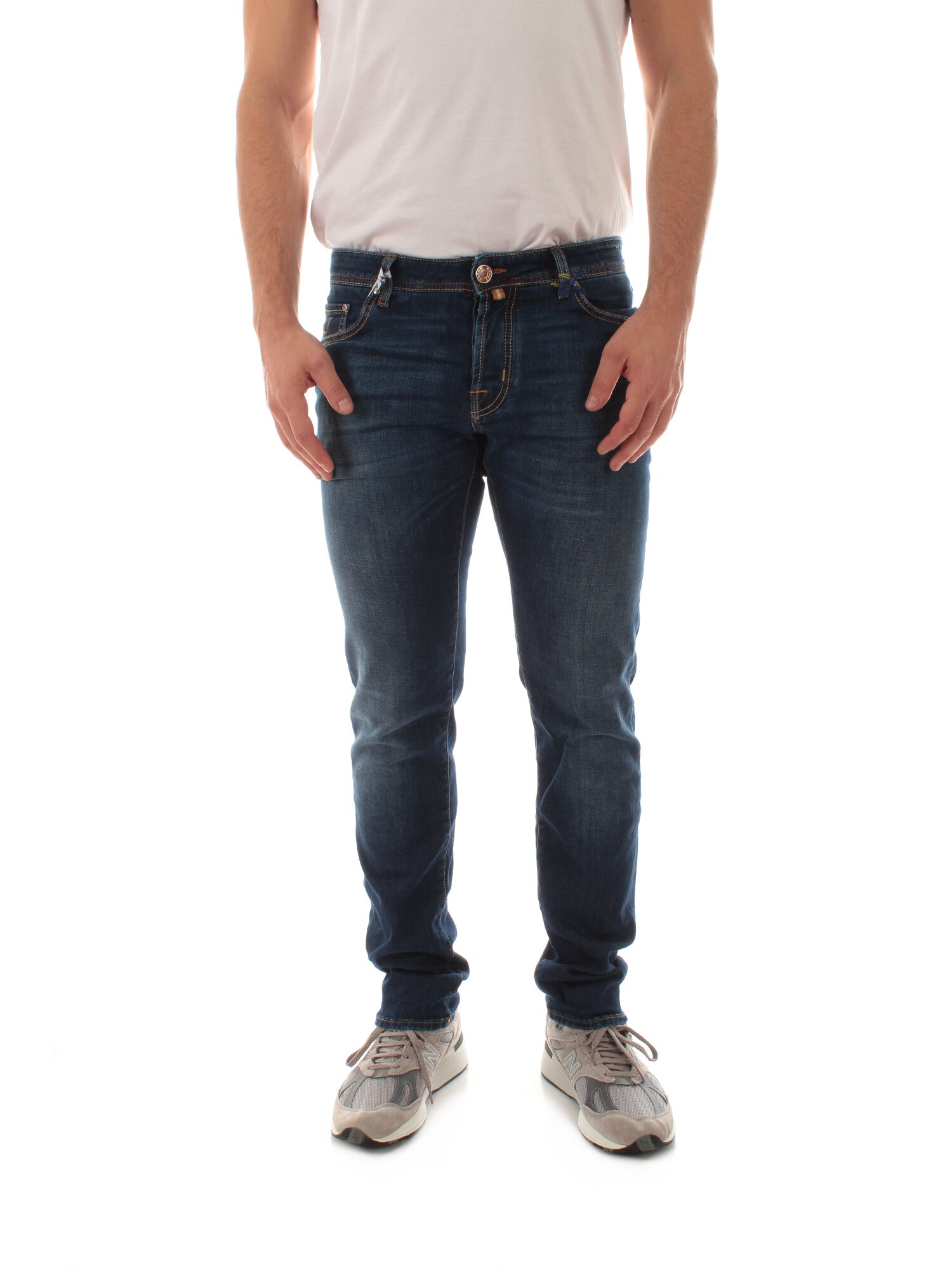 Jeans Nick super slim fit, modello 5 tasche con logo ricamato sul taschino. Vita bassa. Salpa in cavallino con logo laserato. Chiusura con bottoni. Include foulard con stampa di collezione. Profumati con l'esclusiva fragranza Jacob Cohën. Altezza modello: 185 cm. Taglia indossata: 33. 92% Cotone, 8% Elastan