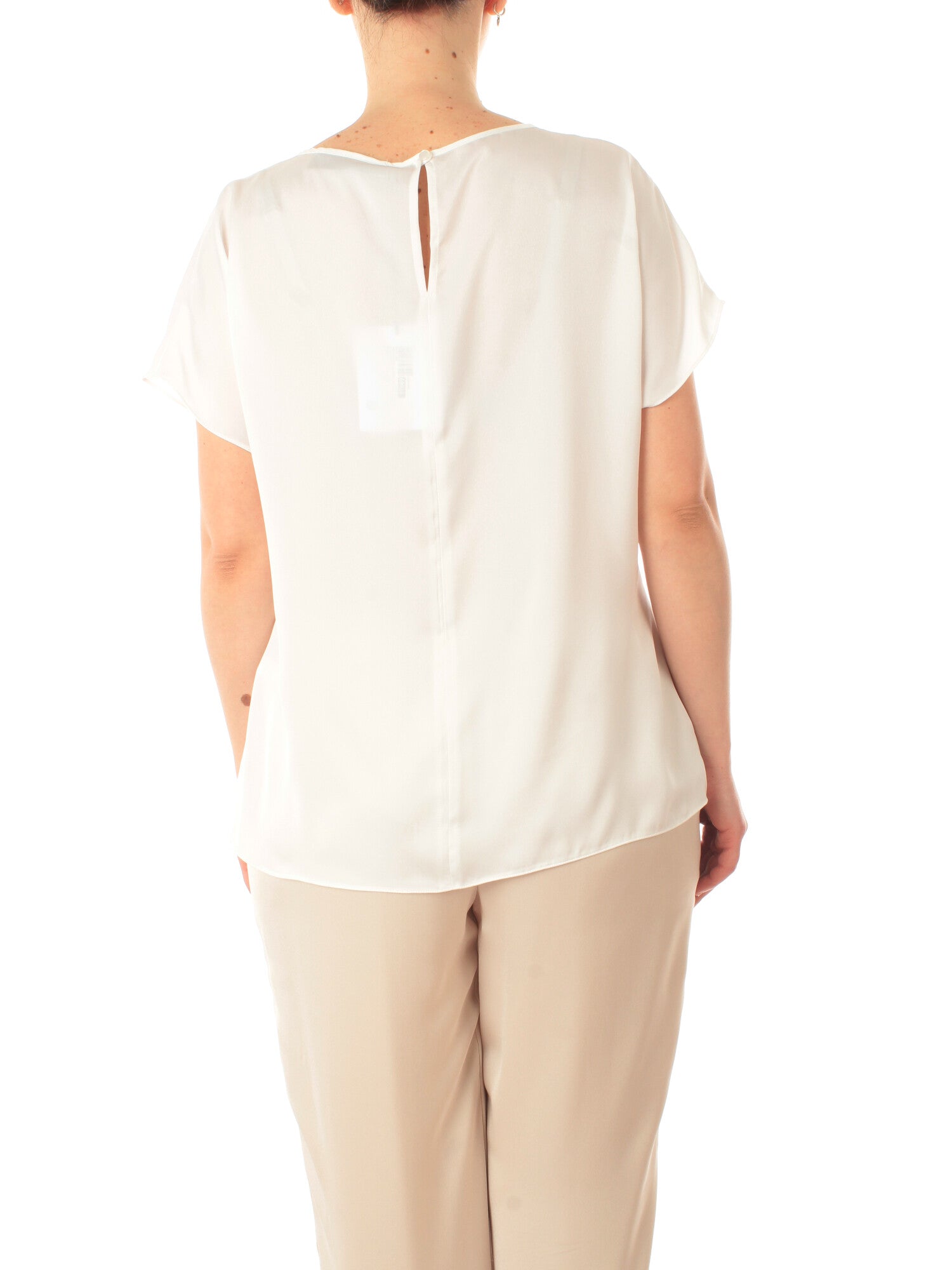 Blusa in raso con scollo tondo chiuso con bottone sul retro e manica corta. Altezza modella: 170 cm. Taglia indossata: 43. 100% poliestere