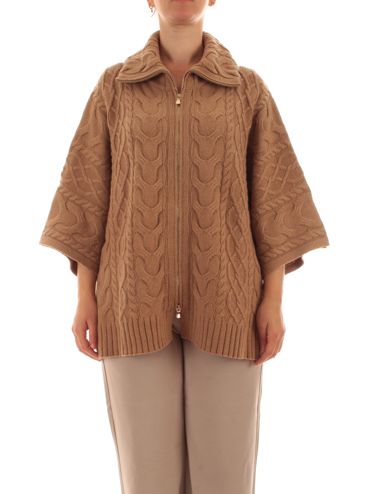 Cardigan over dalla lavorazione effetto "3D", con intrecci che ricordano i tradizionali Aran irlandesi. E' realizzato in pura lana, morbida e avvolgente; apertura a zip doppio cursore e collo alto. Modello a mantella. Altezza modella: 170 cm. Taglia indossata: 1. 100% lana