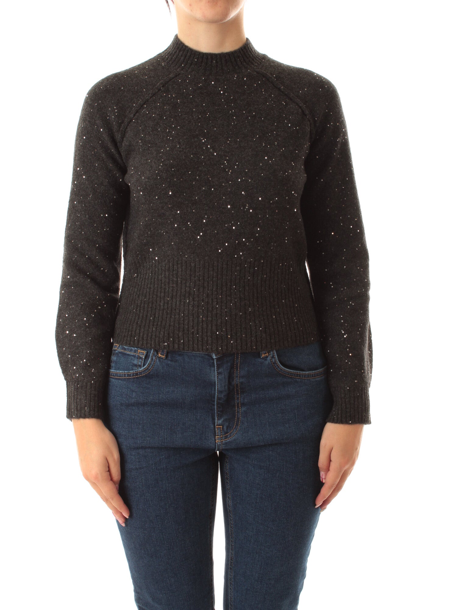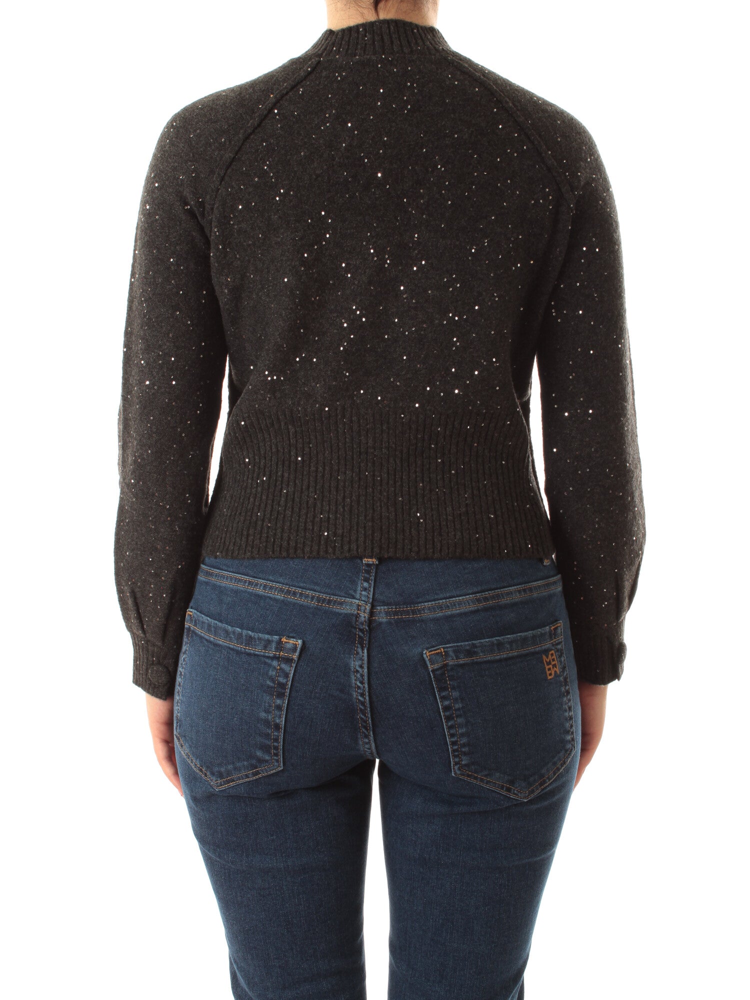 Maglia in filato comfy con paillette. Fit cropped. Collo a cratere con manica raglan. Motivo di cuciture esterne su spalla e fianchi. Bordo alto al fondo lavorato a coste, con bottone al polso. Altezza modella: 172 cm. Taglia indossata: S. 72% poliestere, 20% acrilica, 6% lana, 2% elastan