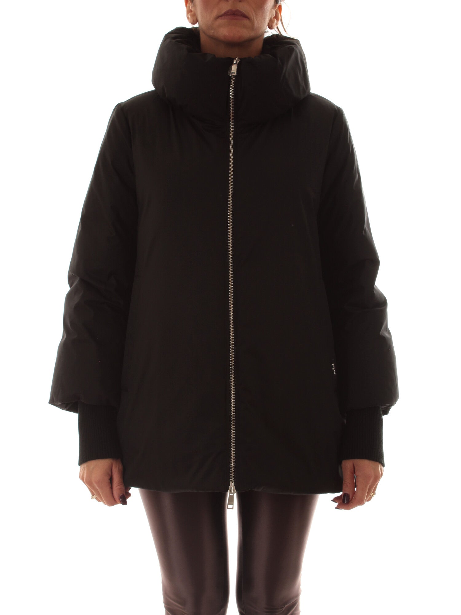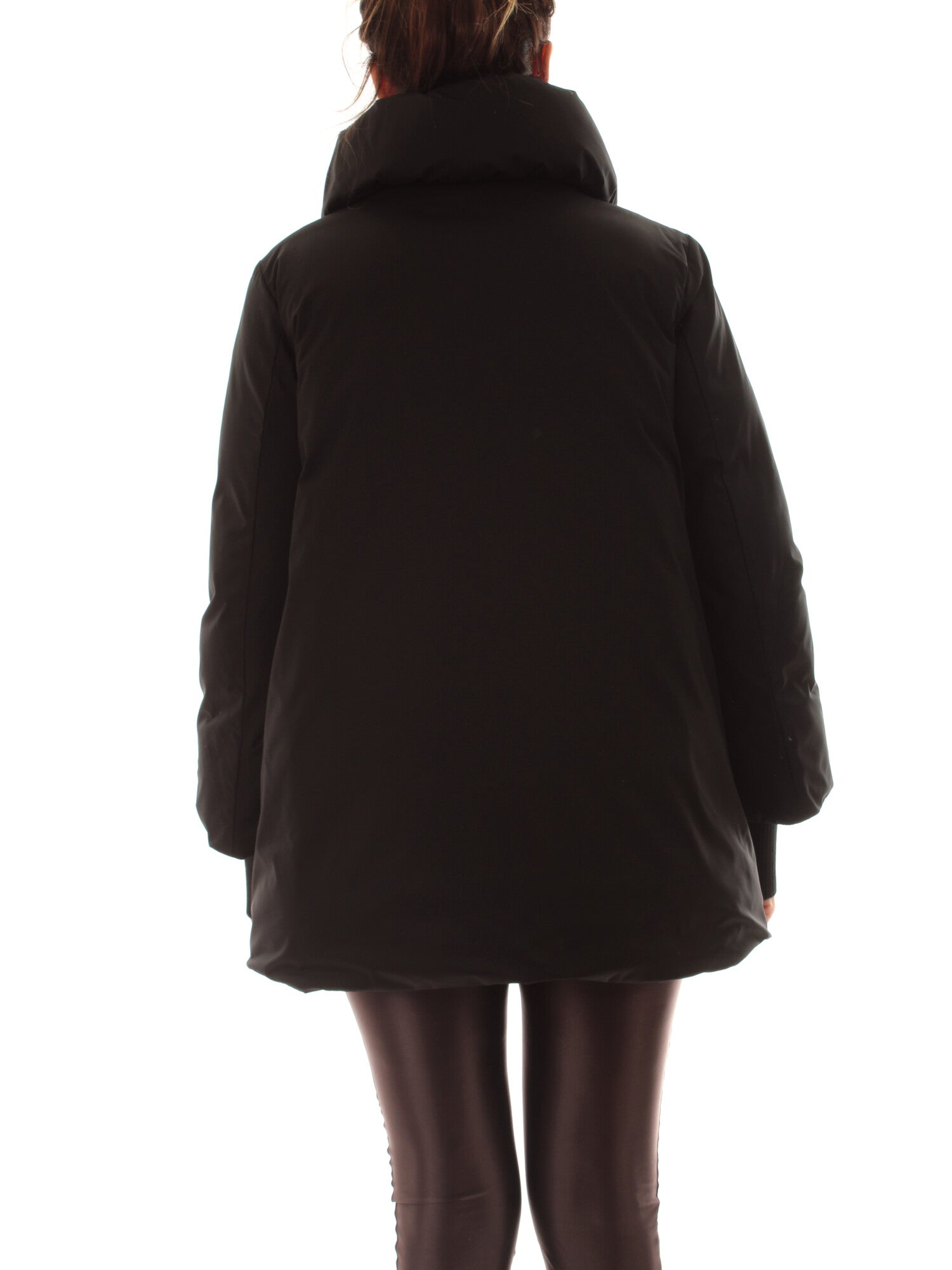 Piumino in tessuto antigoccia lucido con collo alto, maniche lunghe con polsini in maglia removibili e chiusura con zip a doppio cursore. Tasche laterali con bottone a pressione. Fondo con coulisse interna da stringere. Altezza modella: 170 cm. Taglia indossata: 40. 100% poliestere