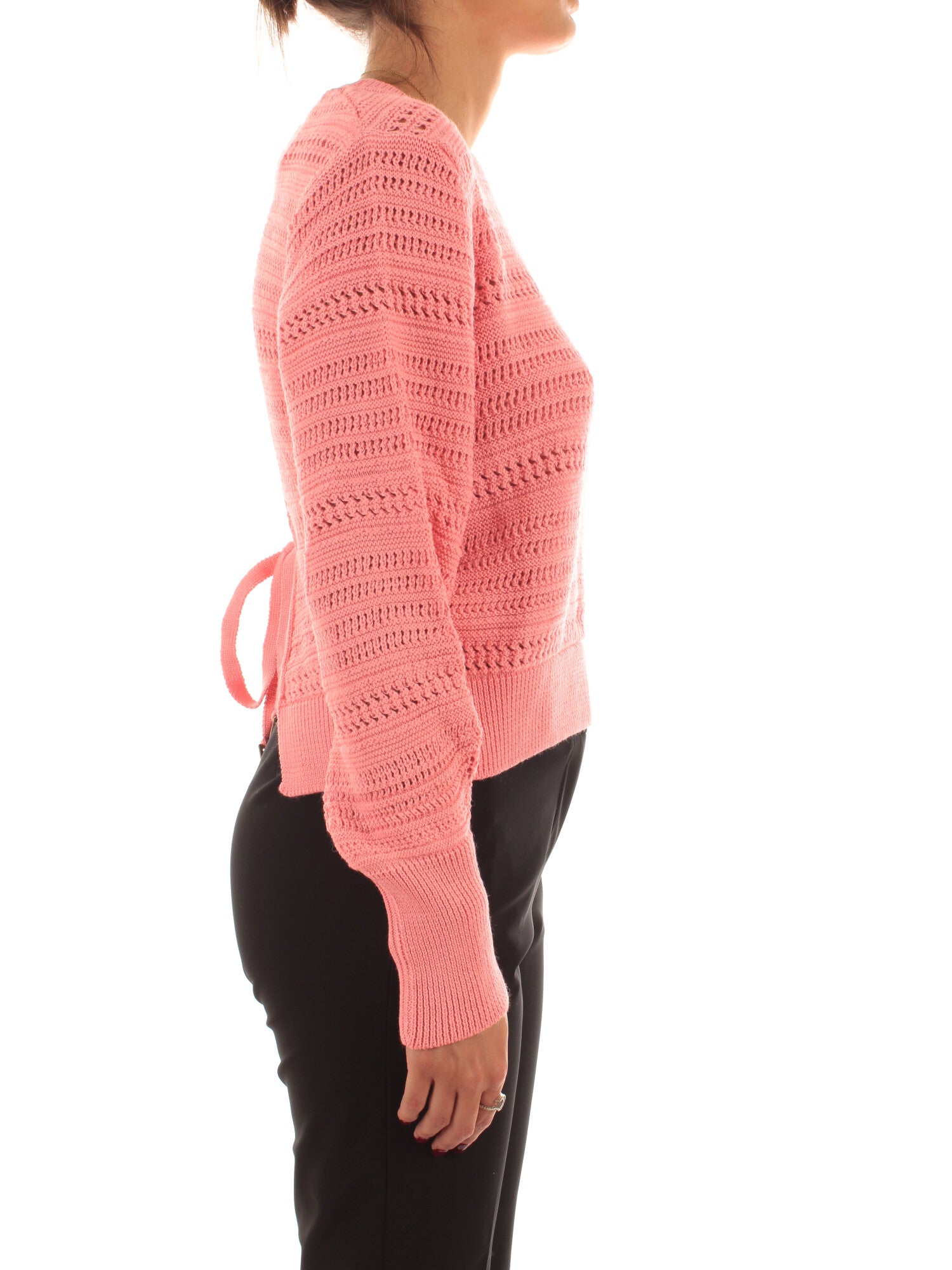 Maglia girocollo in lana merino dal design moderno e femminile, con lavorazione traforata e sorprendente dettaglio sul retro con apertura a goccia e chiusura a fiocco. Altezza modella: 172 cm. Taglia indossata: S. 50% LANA MERINO, 50% ACRILICO