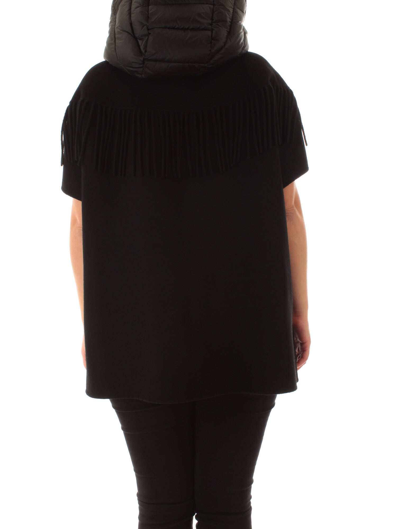 Cappa sfoderata in caldo tessuto double, con spacchi laterali, cappuccio staccabile in nylon. Frangia lungo il carré dietro, che aggiunge grinta al capo, bottoni automatici nascosti. Avvolgente e calda, dalle molteplici attitudini, perfetta per completare un look moderno e sofisticato. Altezza modella: 170 cm. Taglia indossata: 1. 60% lana, 40% poliestere