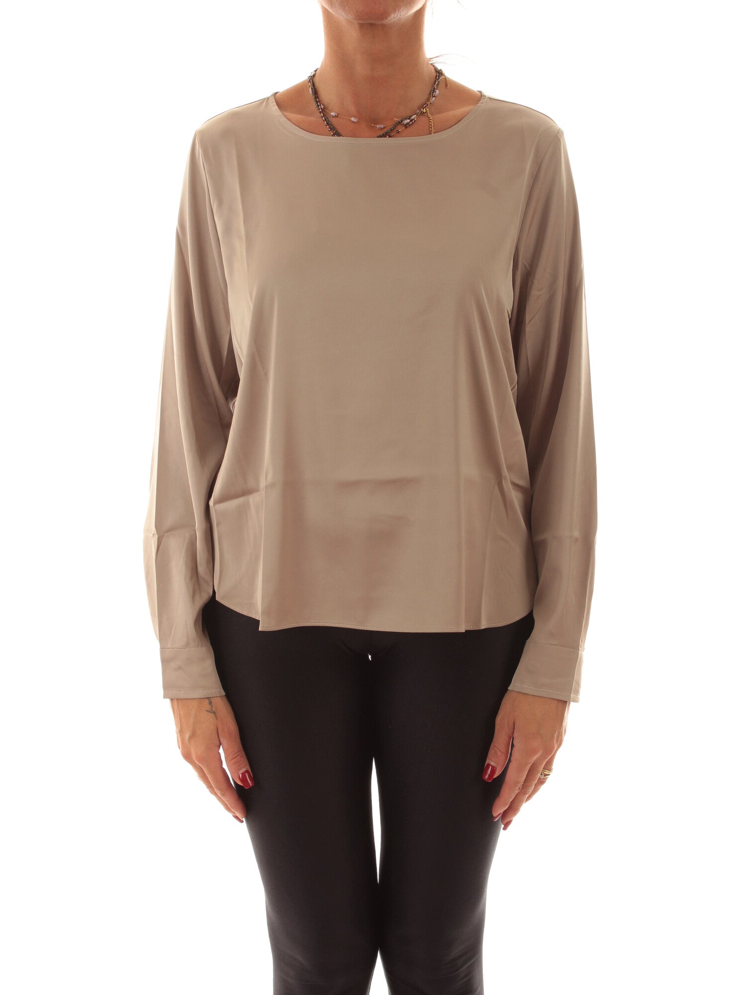 Blusa in raso con scollo tondo e manica lunga. Altezza modella: 172 cm. Taglia indossata: 40. 100% poliestere