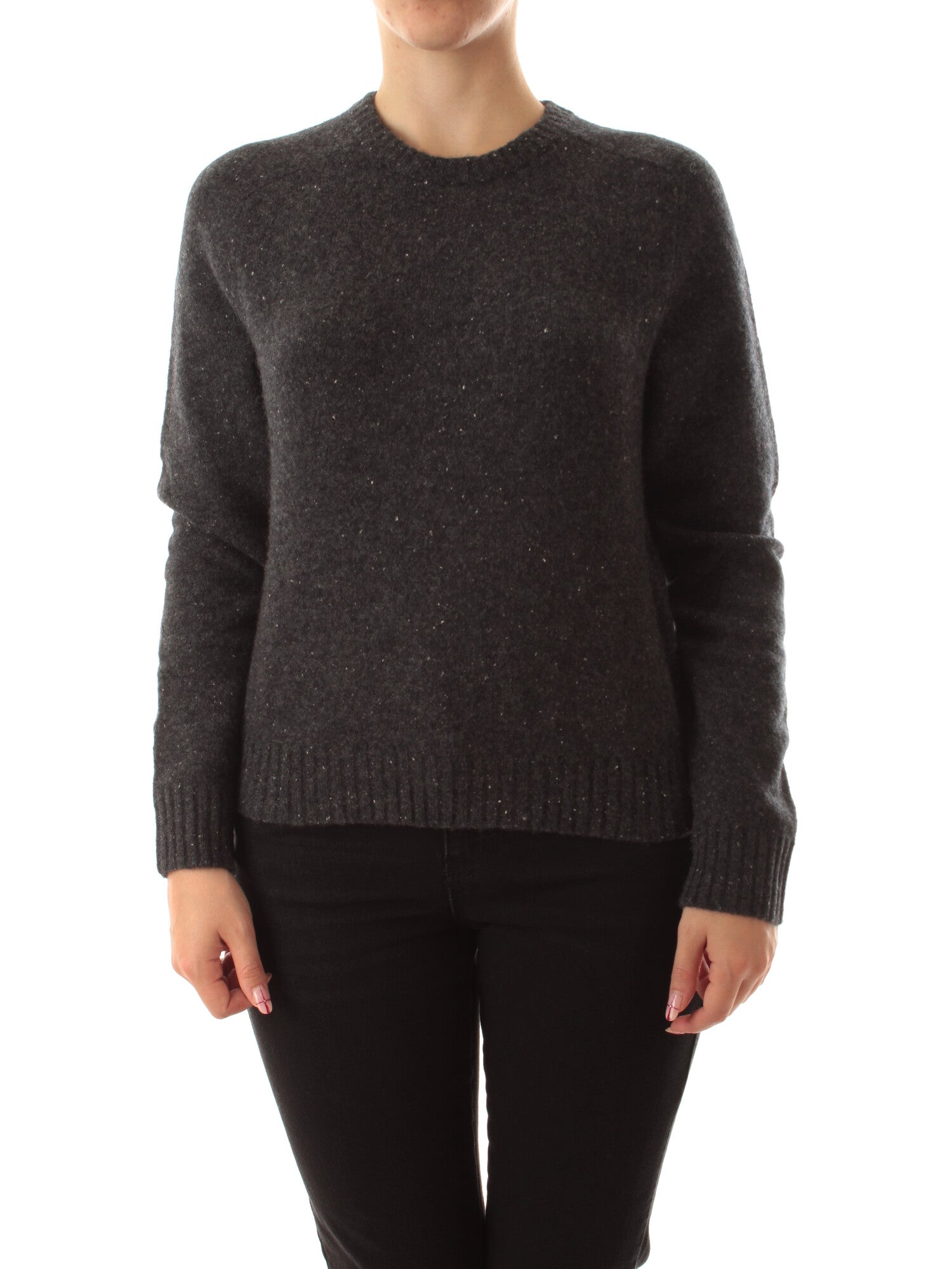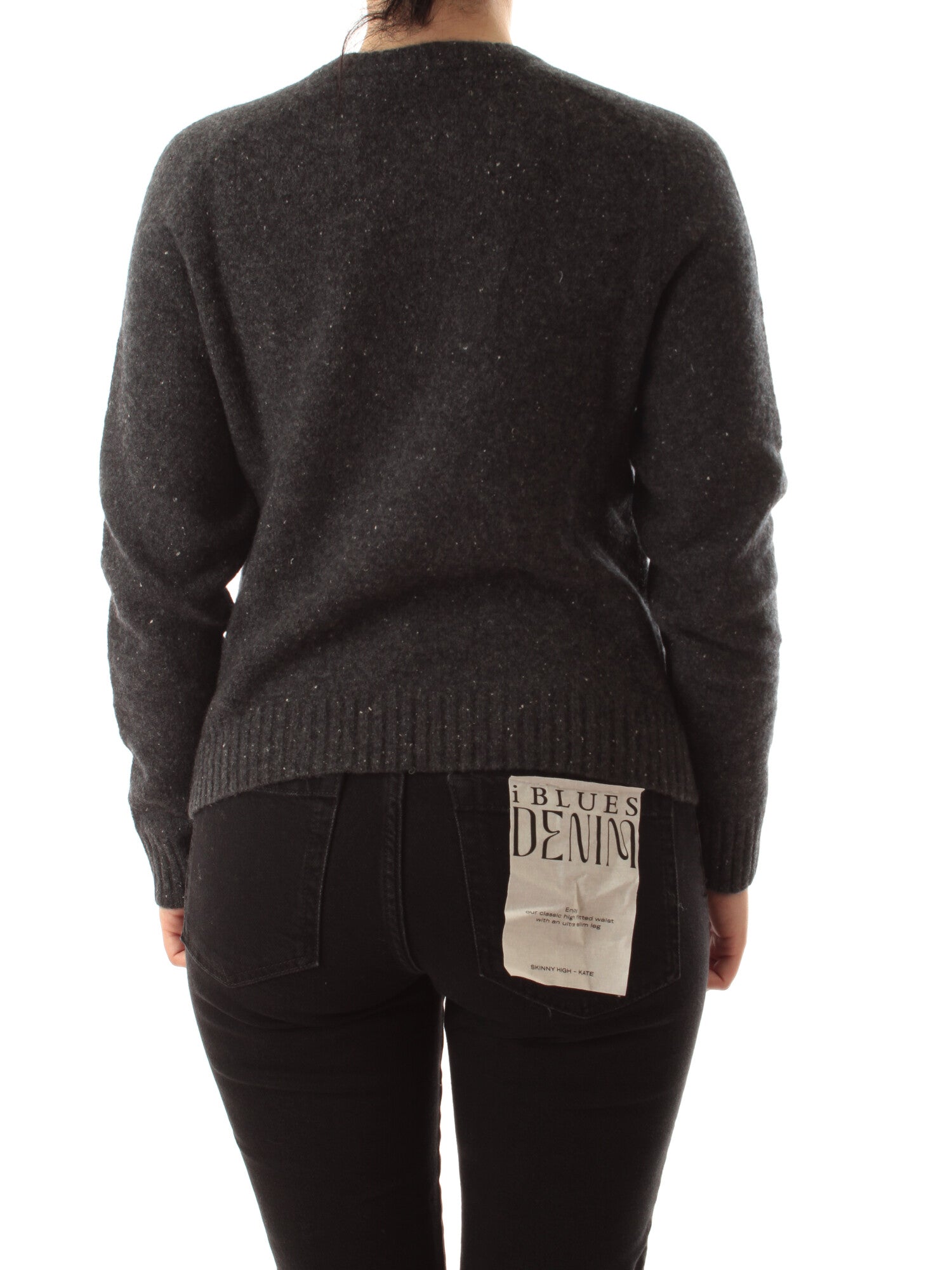 Maglia in filato misto lana con scollo tondo e manica lunga. Bordi lavorati a costine. Altezza modella: 172 cm. Taglia indossata: 40. 48% lana, 23% poliammide, 20% cotone, 5% seta, 4% elastan