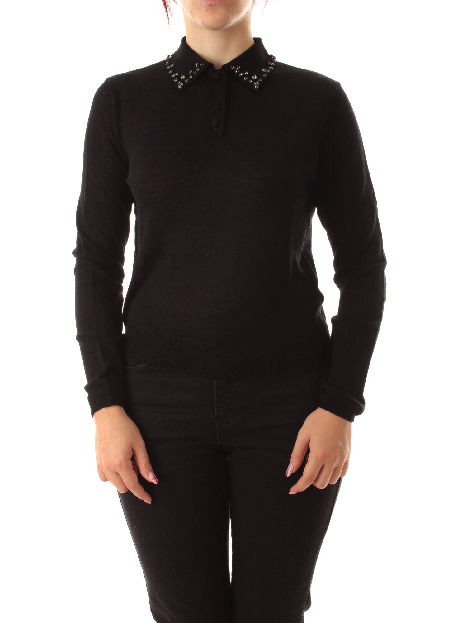 Maglia in filato misto lana. Linea aderente. Colletto con applicazioni in strass, maniche lunghe. Chiusura a polo con bottoni ricoperti in tessuto. Bordi lavorati a costine. Fit aderente. Altezza modella: 172 cm. Taglia indossata: 40. 50% lana, 50% acrilica