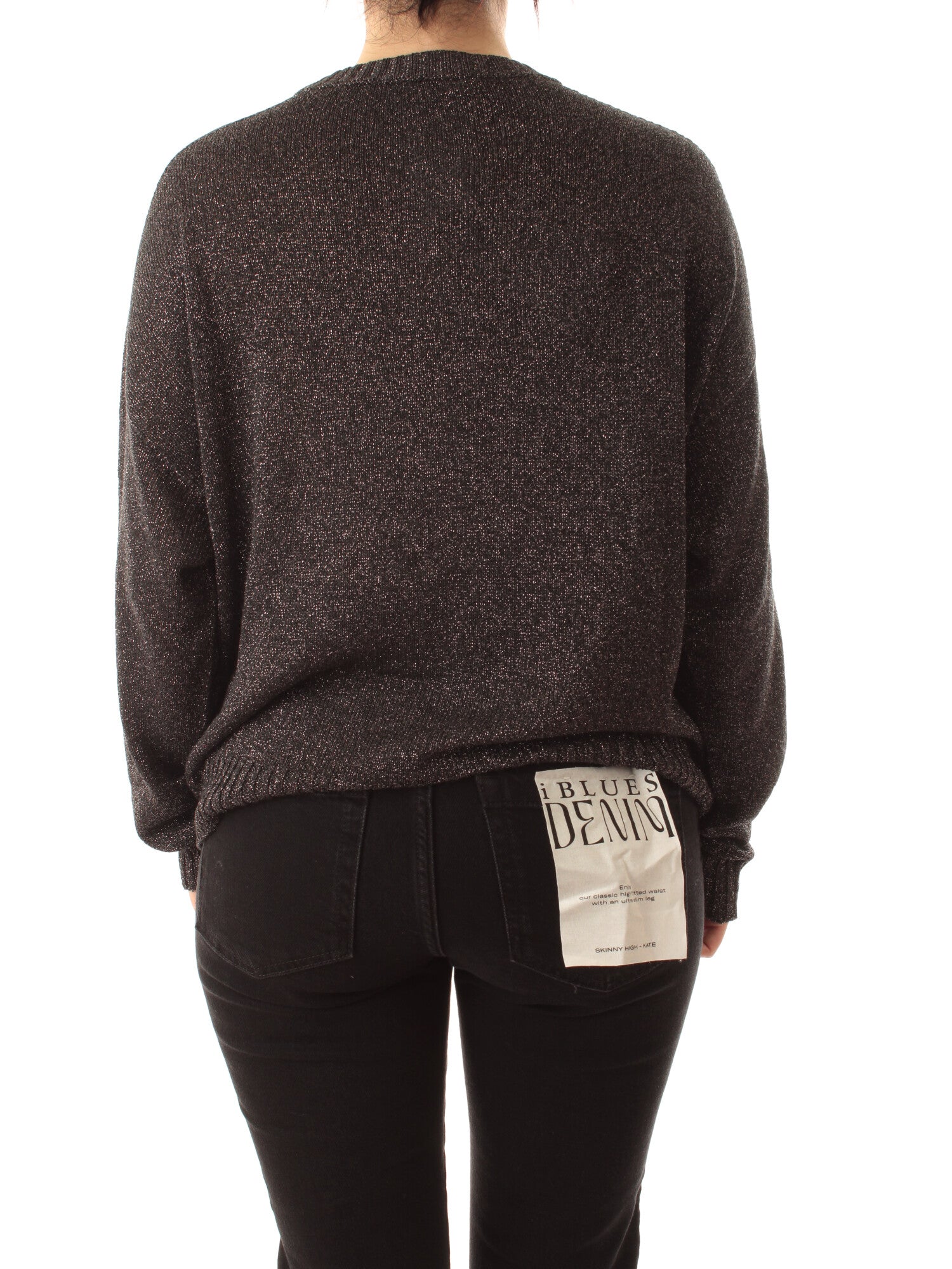Maglia girocollo in filato lurex a manica lunga con bordi a coste. Altezza modella: 172 cm. Taglia indossata: S. 80% viscosa, 20% fibra metallizzata