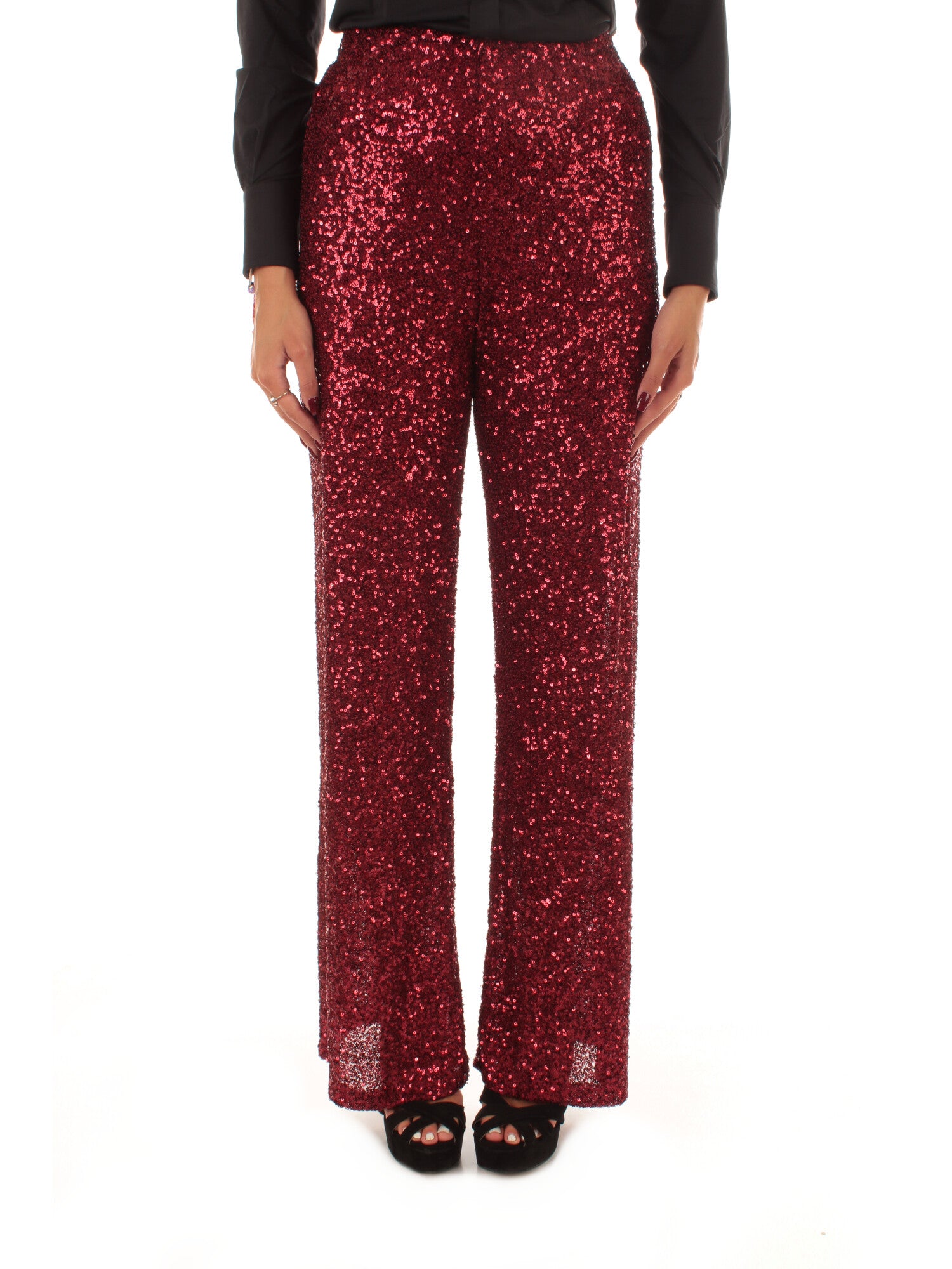 Pantalone a palazzo in full paillettes con banda elastico in vita. Altezza modella: 172 cm. Taglia indossata: S. 95% poliestere, 5% elastan