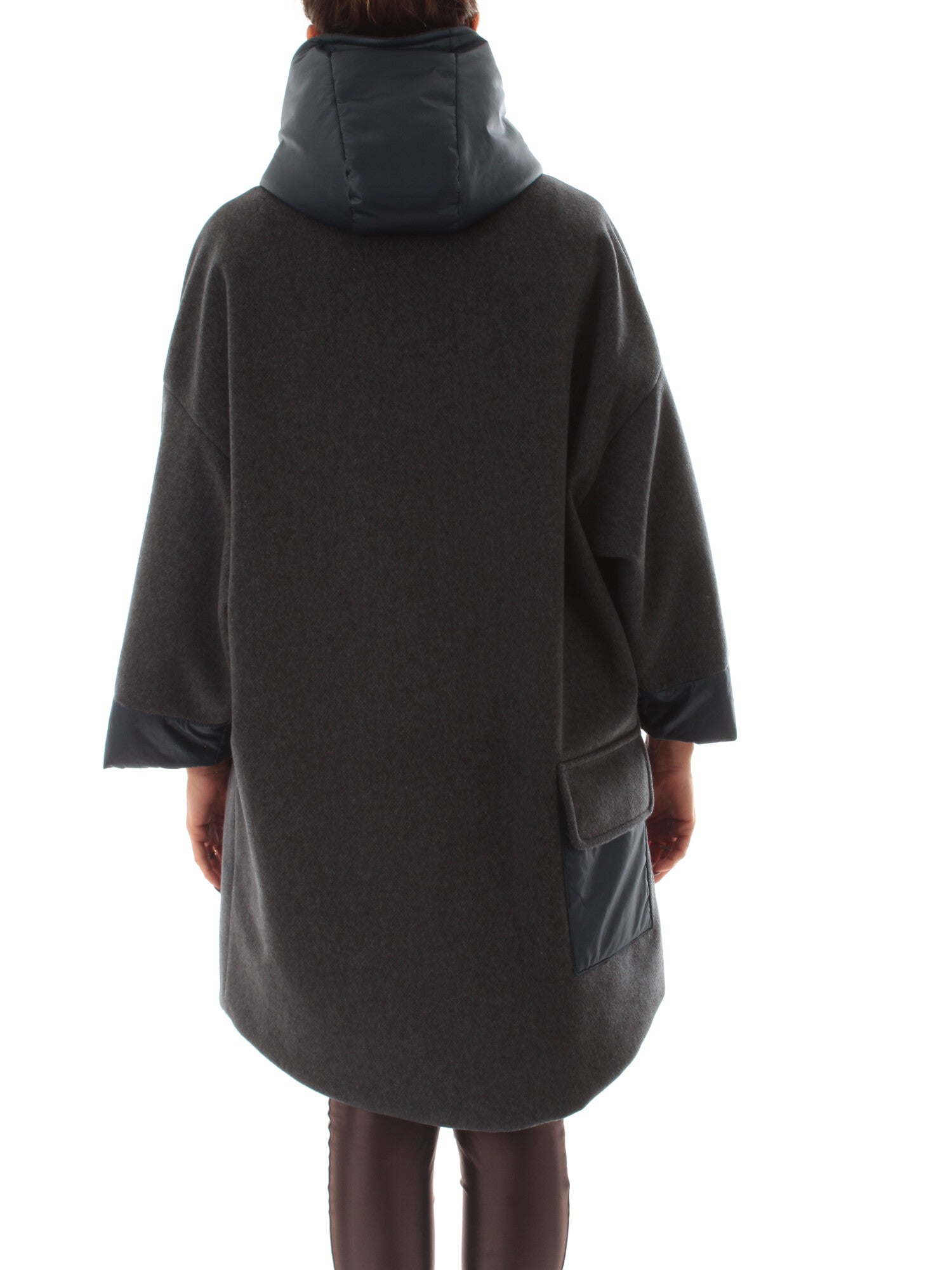 Cappotto in panno con tessuto e fodera in tessuto impermeabile. Chiusura centrale con bottoni a pressione e tasche a filo. Altezza modella: 170 cm. Taglia indossata: 38. 88% poliestere, 12% viscosa