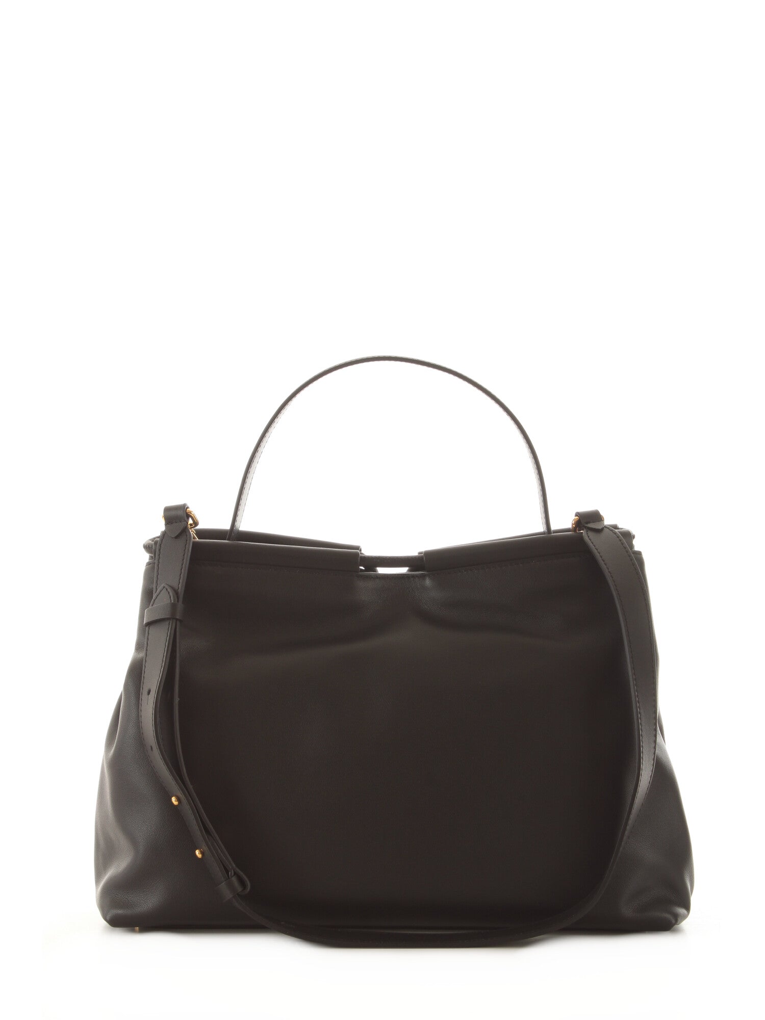 Borsa in pelle liscia. Portabilità a mano e a tracolla. Chiusura con magnete. Manico in pelle. Tracolla regolabile e removibile. Galvanica oro chiaro. Logo timbro oro. Misure: 37x24x14 cm. 100% pelle