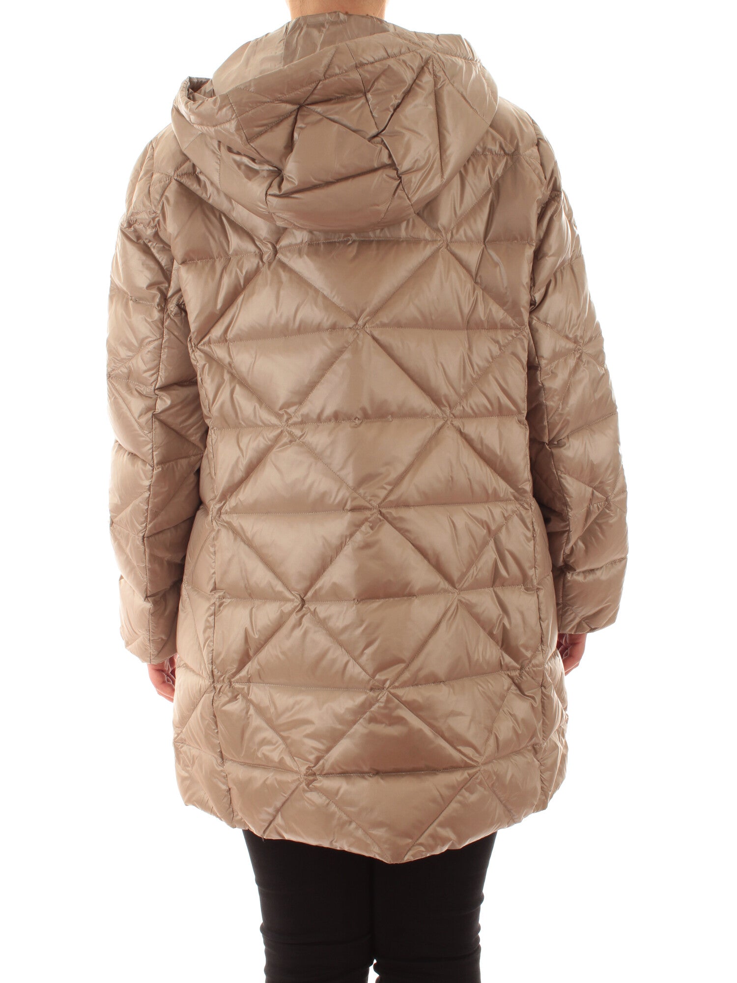 Piumino lungo in nylon antigoccia dalla trapuntatura disegno origami. Tasche con zip con interni di fodera calda; chiusura davanti con bottoni automatici, collo alto e cappuccio rimovibile. Interno in vera piuma, perfetto per le temperature più basse. Altezza modella: 170 cm. Taglia indossata: 48. 100% poliammidica