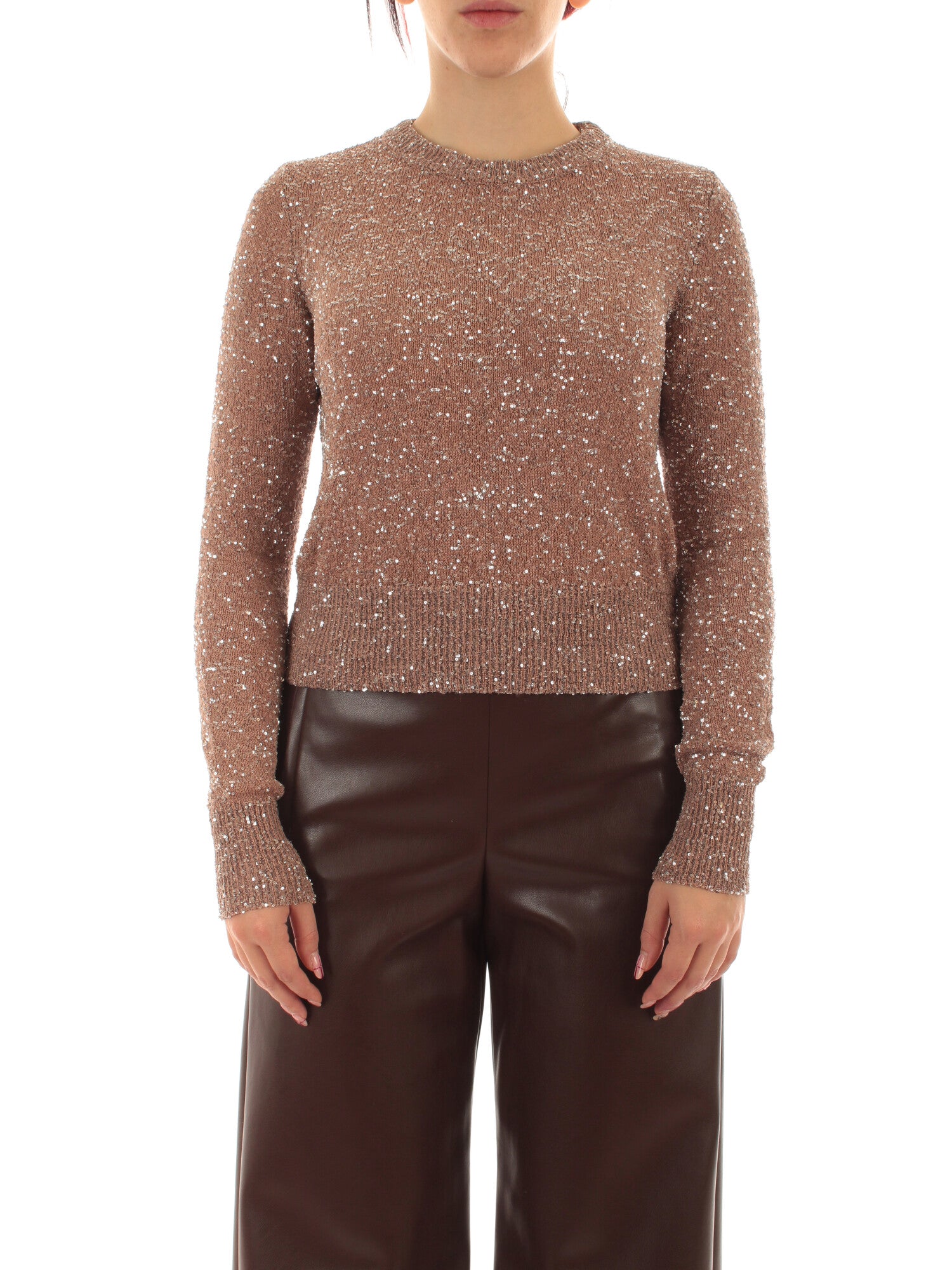 Maglia girocollo in full paillettes con manica lunga e bordi a costine. Sfoderata. Altezza modella: 170 cm. Taglia indossata: S. 55% poliammide, 45% poliestere