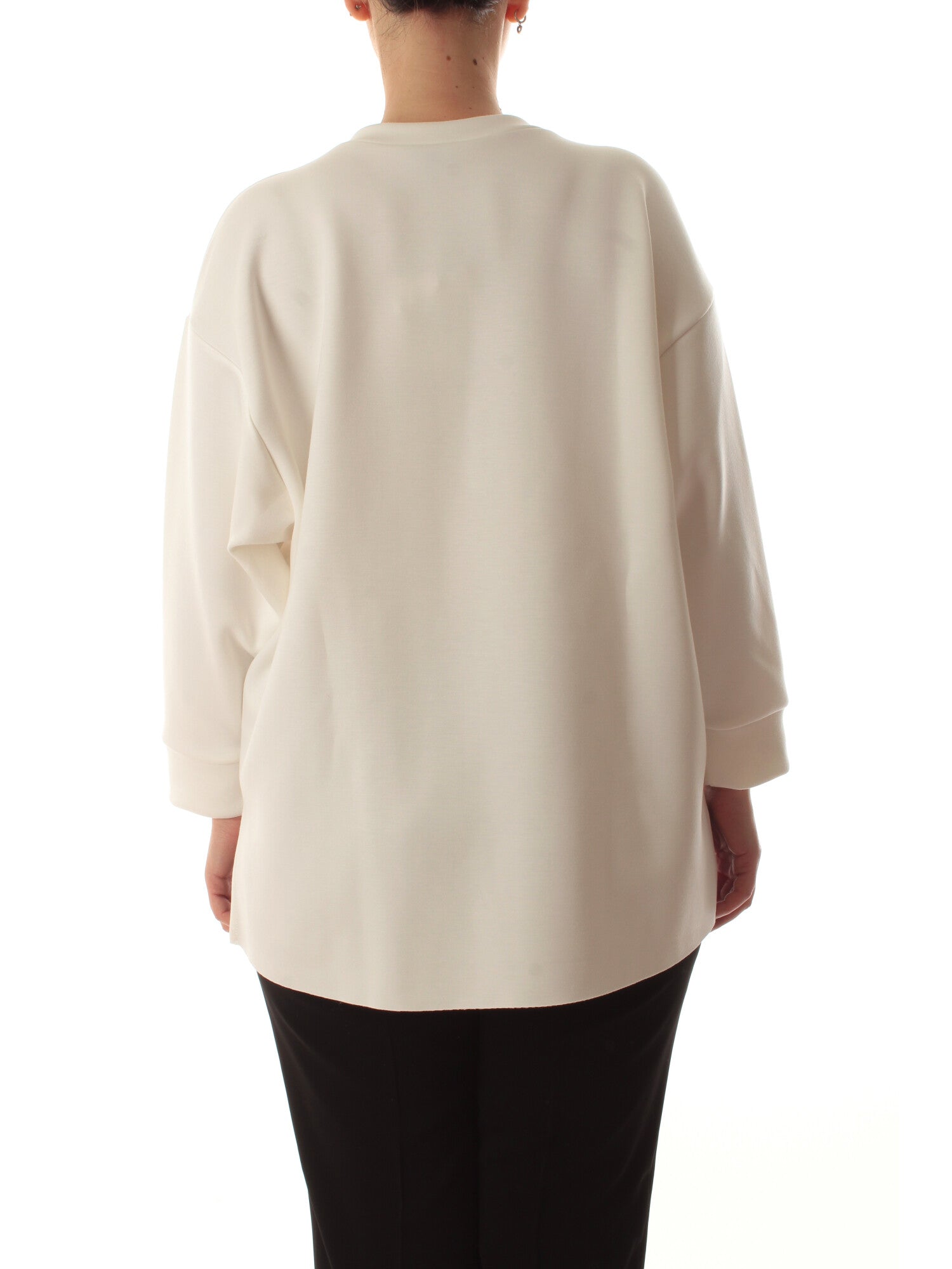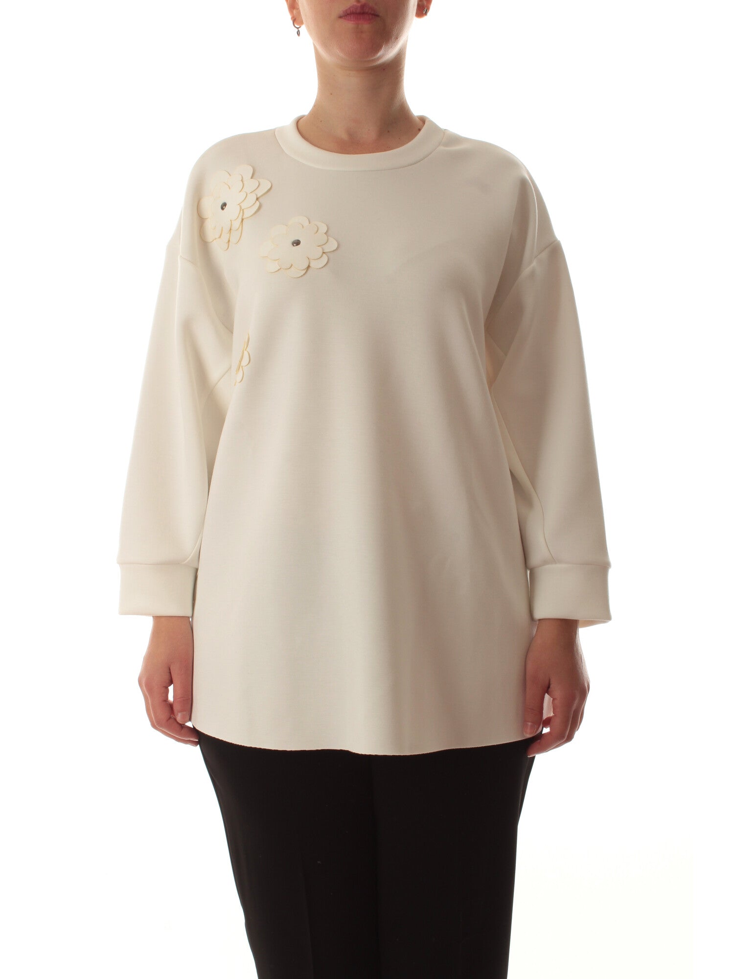 Maglia in tessuto scuba con fiori applicati sul collo, maniche a tre quarti e spacchi laterali. Altezza modella: 170 cm. Taglia indossata: 46. 49% poliestere, 44% viscosa, 7% elastan