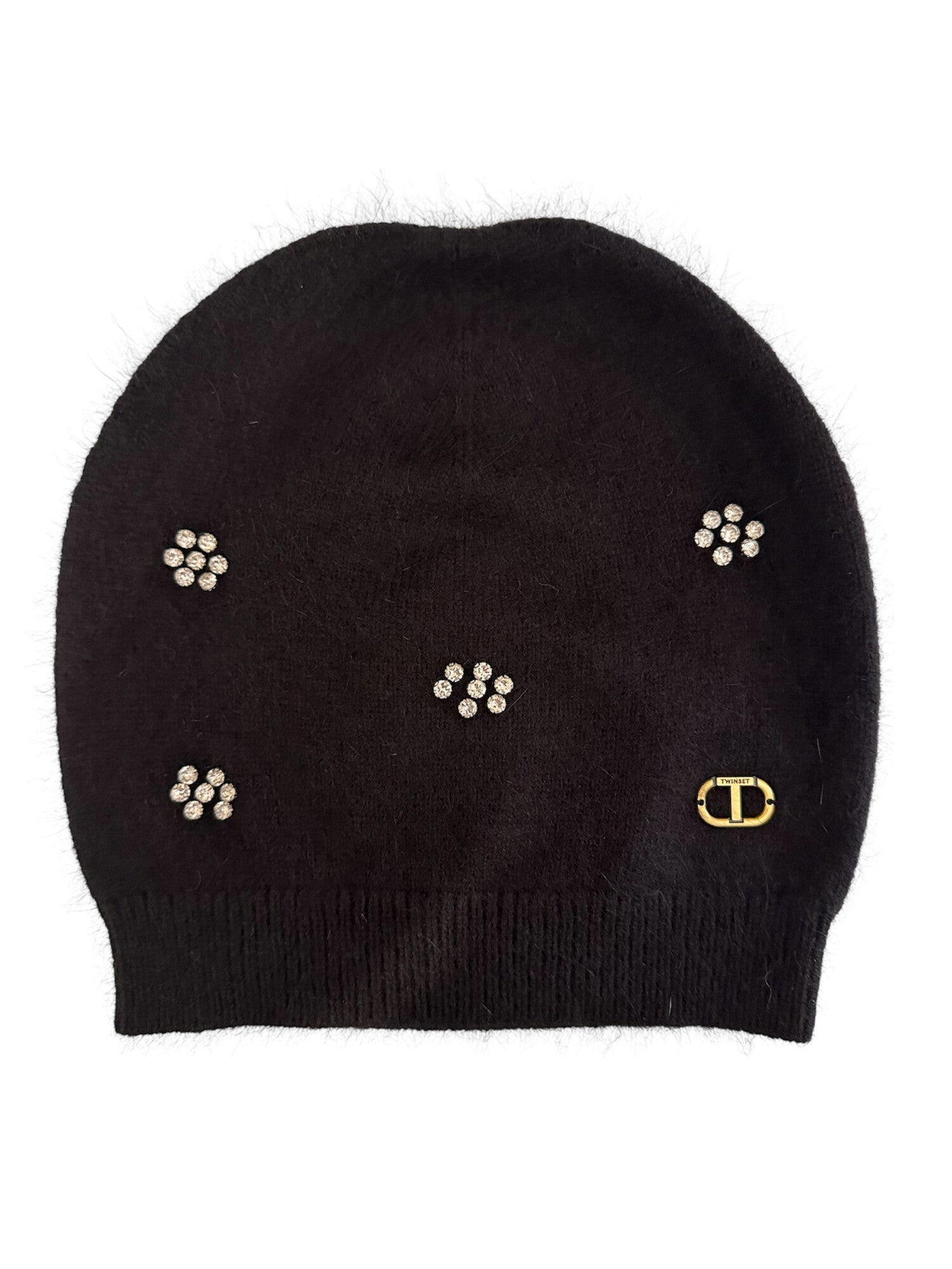 Cappello in tessuto morbido con ricamo di castoni floreali. Dimensioni: 20x23 cm. 70% poliammide, 30% angora