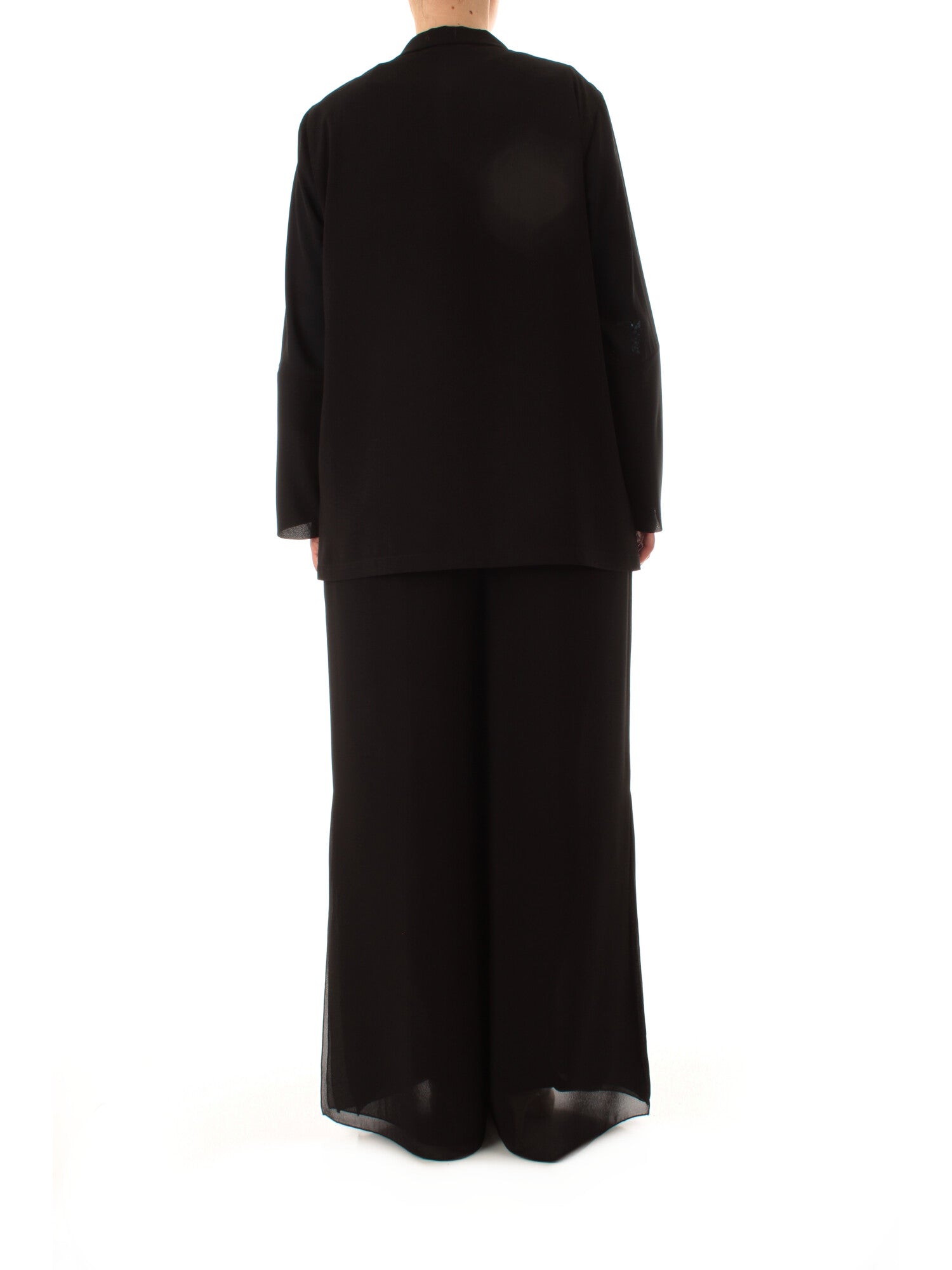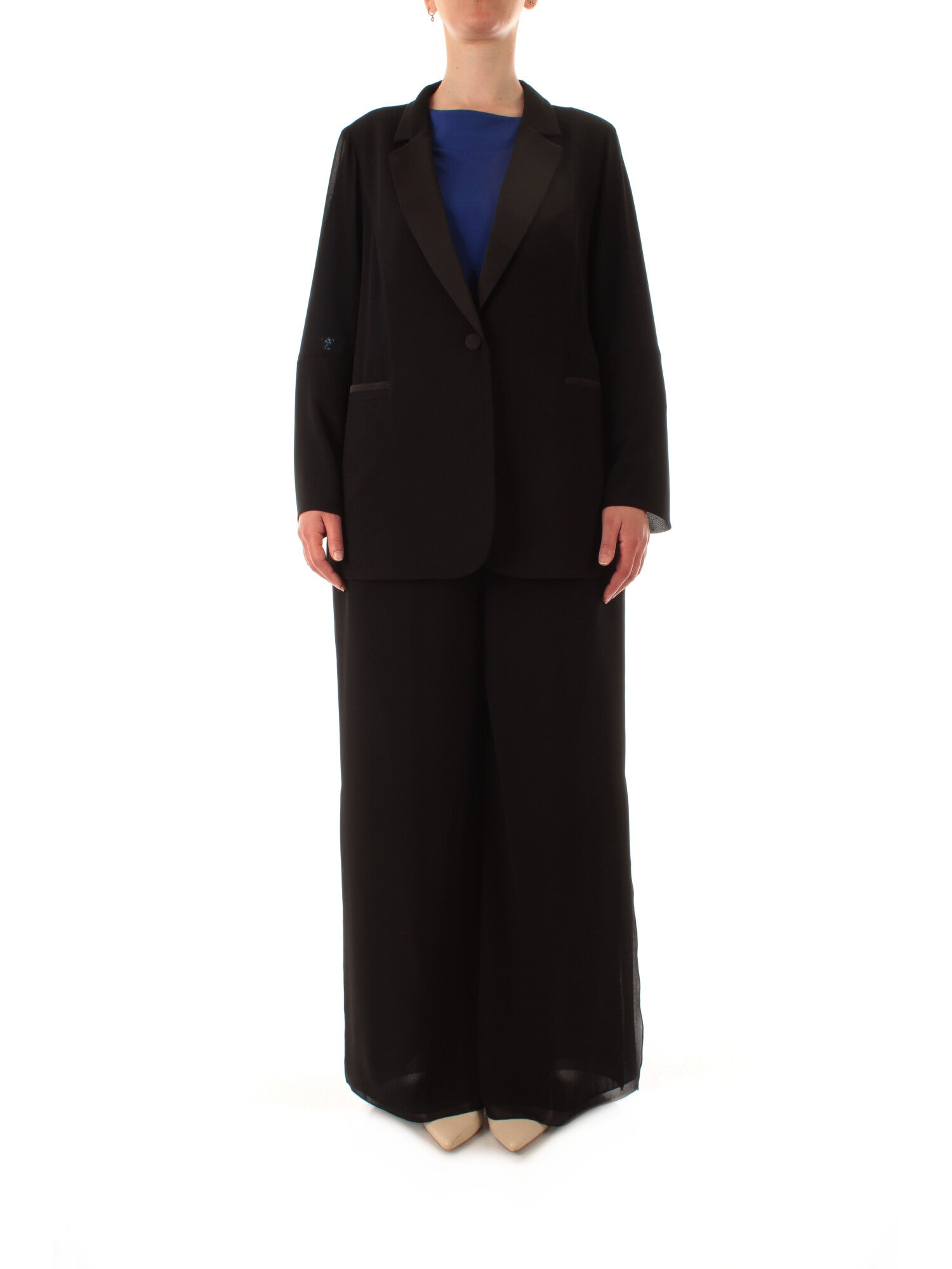 Completo composto da giacca e pantalone. Blazer monopetto in crêpe con rever classico, bottone e tasca a filo in raso. Pantalone wide leg con elastico in vita e zip a scomparsa. Altezza modella: 170 cm. Taglia indossata: 46. 100% poliestere