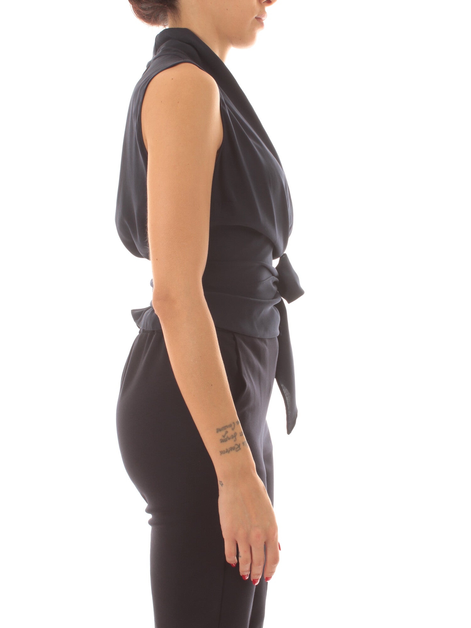 Top in seta con scollo a V incrociato e fasce laterali da annodare in vita. Altezza modella: 170 cm. Taglia indossata: 40. 94% seta, 6% elastan