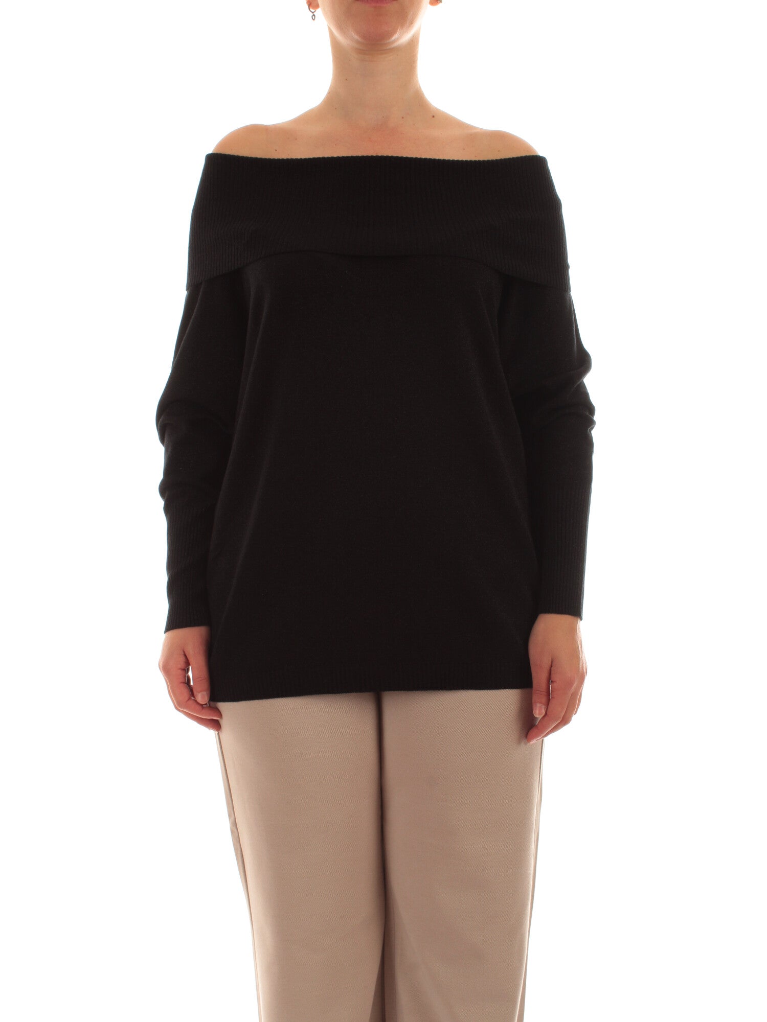 Maglia in viscosa lurex. Linea dritta. Collo ampio da indossare off shoulder. Maniche lunghe. Dettagli rifiniti a costine. Altezza modella: 170 cm. Taglia indossata: S. 62% viscosa, 26% acrilica, 5% poliammide, 4% fibra metallizzata, 3% elastan