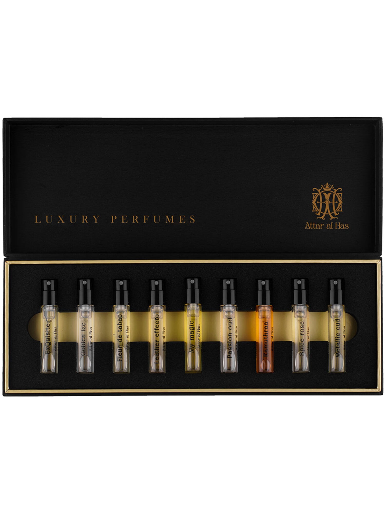 Un elegante cofanetto nero contenente le 9 fragranze più rappresentative del brand Attar al Has : Exqisite, My Magic, Fleur de Tabac, Metalic Oud, Passion Oud, Leather Effecto, Kamuthraa, Golden Ice and Spice Rose.